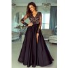 Dlhé večerné šaty s dlhým tylovým rukávom ozdobeným čipkou. Saténová sukňa je na jednej strane vysoko rozstrihnutá, čo krásne ukazuje nohu. Čipka na hornej časti šiat s V-výstrihom zdôrazňuje dĺžku krku. Driek Vám zvýrazní jemný pásik. Šaty sa zapínajú na zadnej strane pomocou zipsu.