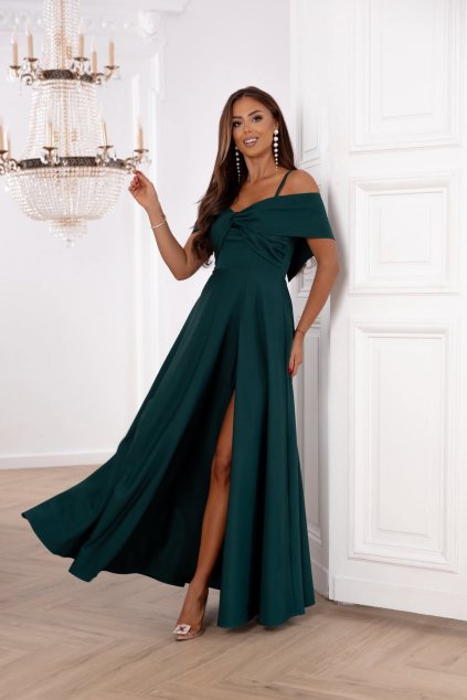Objavte tieto krásne šaty a vyberte si ich na svadbu či inú spoločenskú udalosť. Véčkový výstrih je vpredu aj zozadu šiat. Šaty nie sú na prsiach vystužené. Dlhá sukňa má rázporok a vrchná vrstva je z tylu. K šatám je aj opasok vo farbe šiat. Zapínajú sa zozadu na zips.