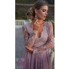 Dokonalé a výnimočné. Tieto dlhé spoločenské šaty si jednoducho zamilujete. Vrch šiat je zdobený nádhernou vyšívanou čipkou doplnenou flitrami. Šaty majú dlhý tylový rukáv, zdobený vyšívanou čipkou. Vrch šiat krásne prilieha k telu, zatiaľ čo tylová sukňa s vysokým výstrihom na jednej strane je bohato nariasená. Chrbát odhaľuje véčkový výstrih. Zapínanie na chrbte pomocou zipsu.