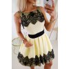 Elegantné žlté šaty doplnené čiernou čipkou sú dokonalé. Čierna čipka sa vyníma na hrudníku, chrbte a na spodnej časti sukne. Na chrbte majú šaty véčkový výstrih. Sukňa je bohatá, s tylovou spodnicou, aby krásne držala tvar po celý čas. K šatám je aj čierny opasok. Zapínanie na chrbte pomocou zipsu.