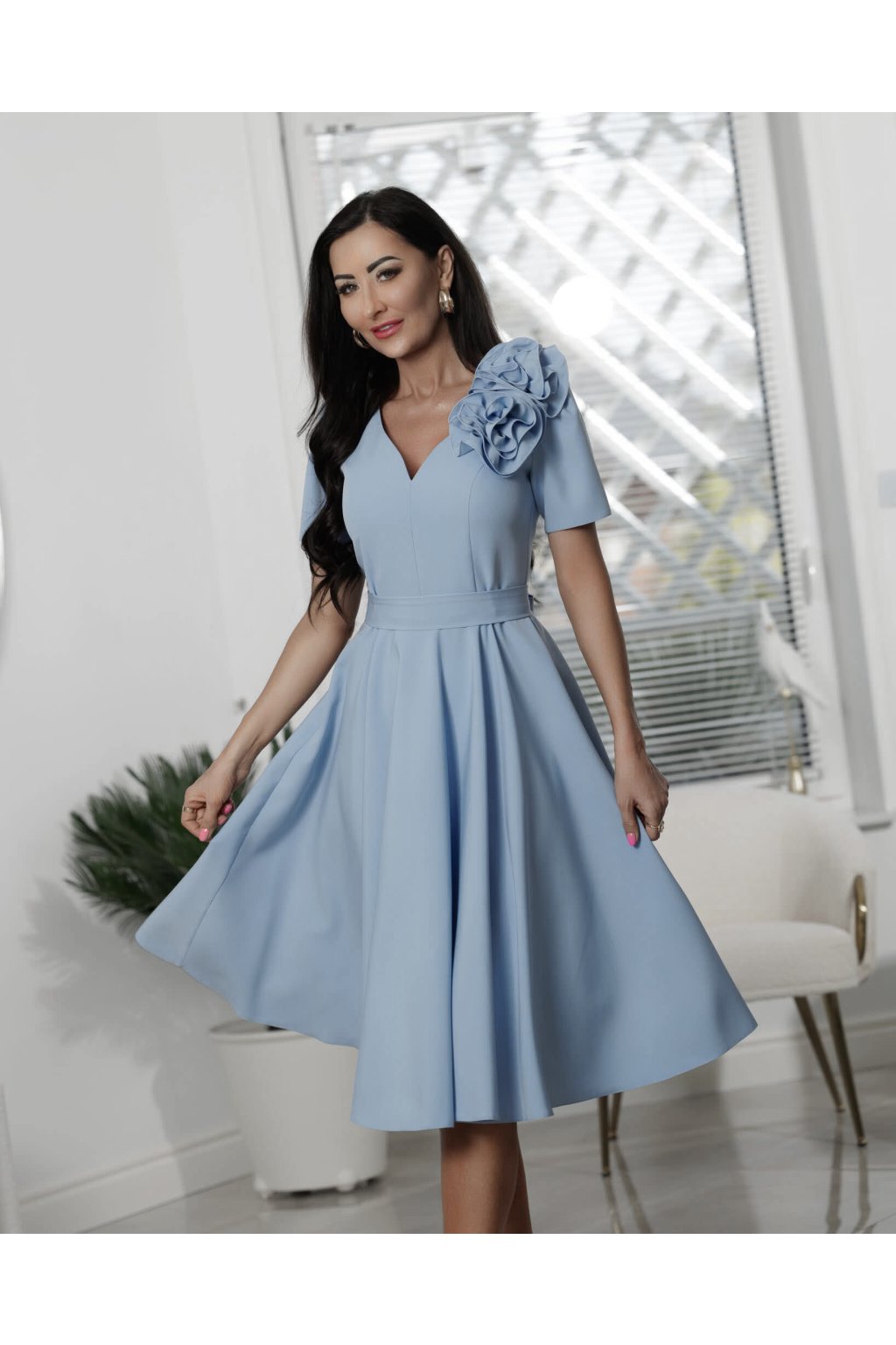 Tieto výnimočné midi šaty sú skvelou voľbou na svadbu či inú spoločenskú udalosť. Šaty sú z hladkej látky. Majú véčkový výstrih a nie sú na prsiach vystužené. Majú krátky rukáv. Sukňa je pod kolená a je padavá. Zapínajú sa zozadu na zips. Súčasťou šiat je odnímateľná kvetinová ozdoba a opasok.