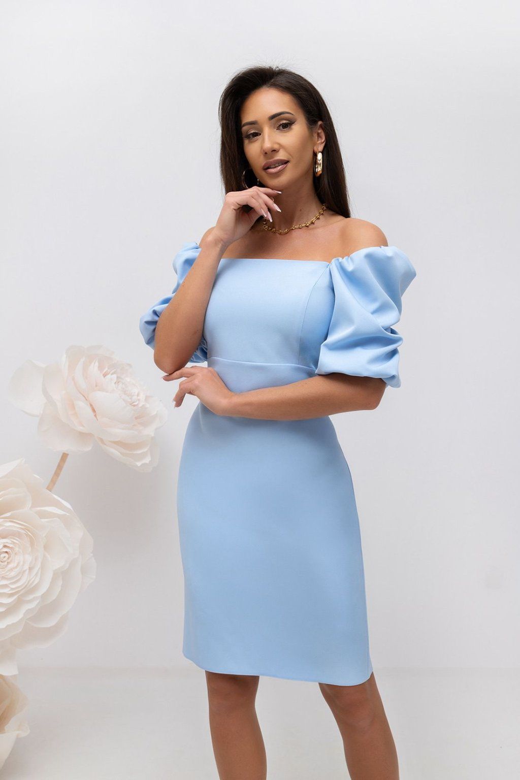 Bledomodré priliehavé šaty s puff rukávmi