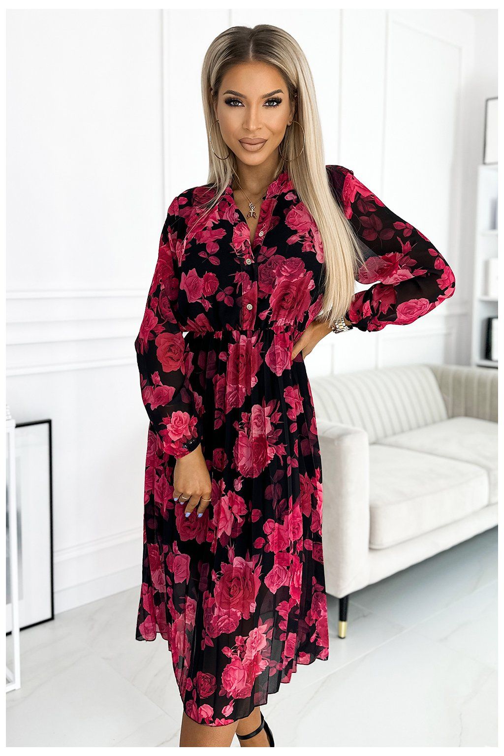 Čierne midi šaty s červenými kvetmi