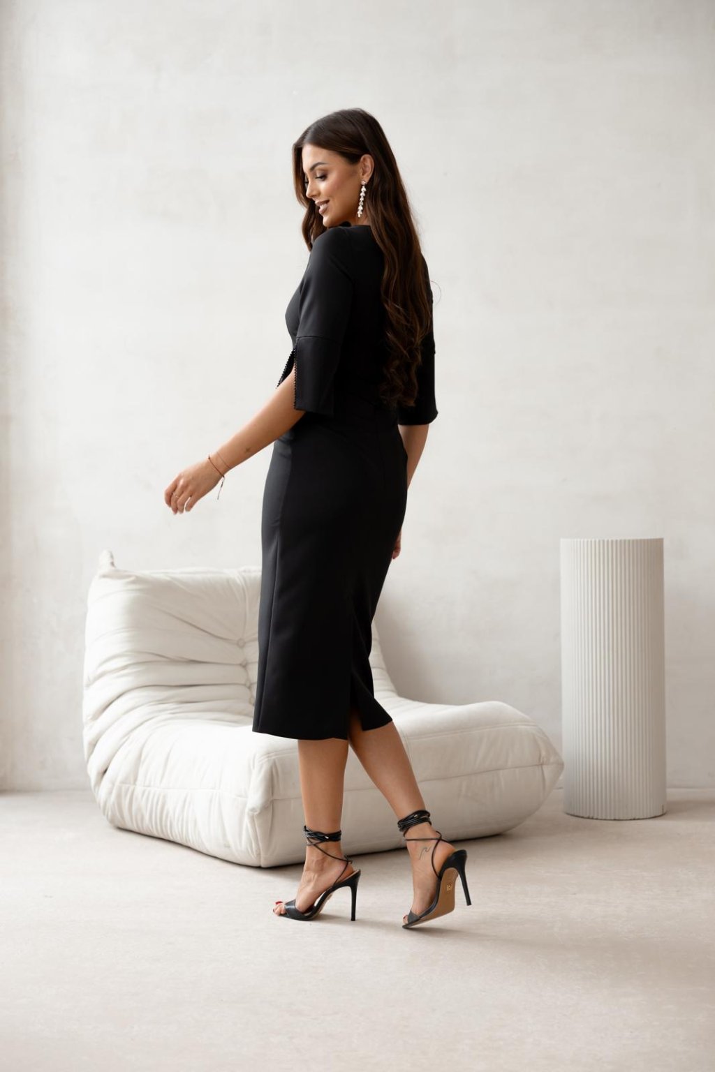 Stavte na jednoduchosť a štýl. Tieto jedinečné šaty sú stvorené na množstvo príležitostí. Sú hladké a elegantné a vďaka kamienkom na opasku a rukávoch sú neprehliadnuteľné. Na prsiach nie sú vystužené. Sukňa je priliehavá a má vzadu rázporok. Zapínajú sa zozadu na zips.