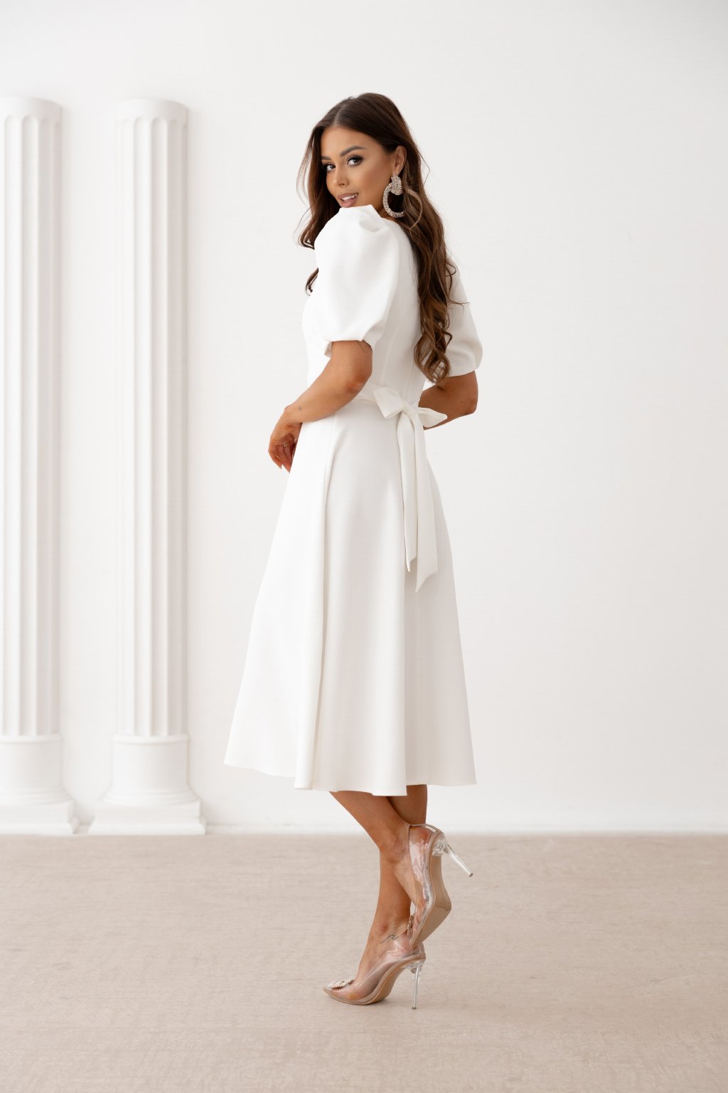 Vsaďte na jednoduchost a styl. Tyto jedinečné midi šaty jsou stvořeny pro řadu příležitostí. Díky trendy puff rukávům jsou šaty nepřehlédnutelné. Na prsou nejsou vyztužené. Vzadu na zádech mají jemný véčkový výstřih. Sukně je padavá. Zapínají se zezadu na zip. K šatům je na pevně připojen opasek.