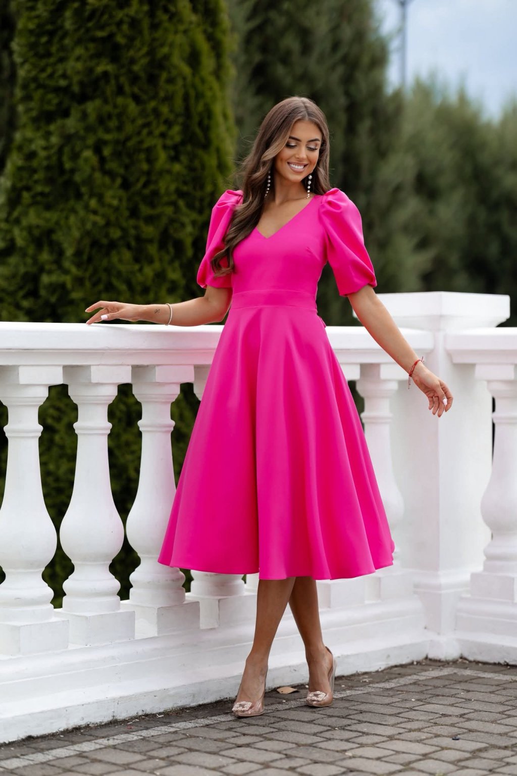 Vsaďte na jednoduchost a styl. Tyto jedinečné midi šaty jsou stvořeny pro řadu příležitostí. Díky trendy puff rukávům jsou šaty nepřehlédnutelné. Na prsou nejsou vyztužené. Zádá jsou kryté. Sukně je padavá. Zapínají se zezadu na zip. K šatům je na pevně připojen opasek.