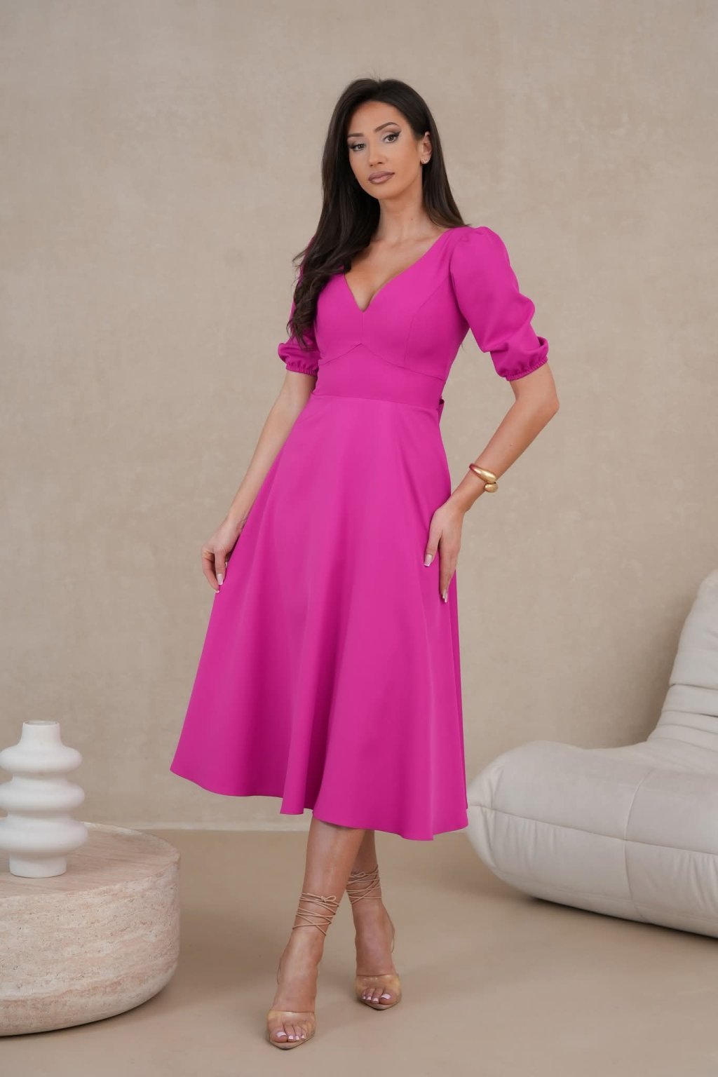 Elegantní, hladké midi šaty jsou skvělou volbou pro svatby, promoce či jiné události. Výstřih je véčkový, pod prsy je výrazný hrubý pas. Šaty nejsou na prsou vyztužené. Rukáv je tříčtvrteční, ukončený gumičkou. Sukně je padavá. Zapínají se na zádech na zip.