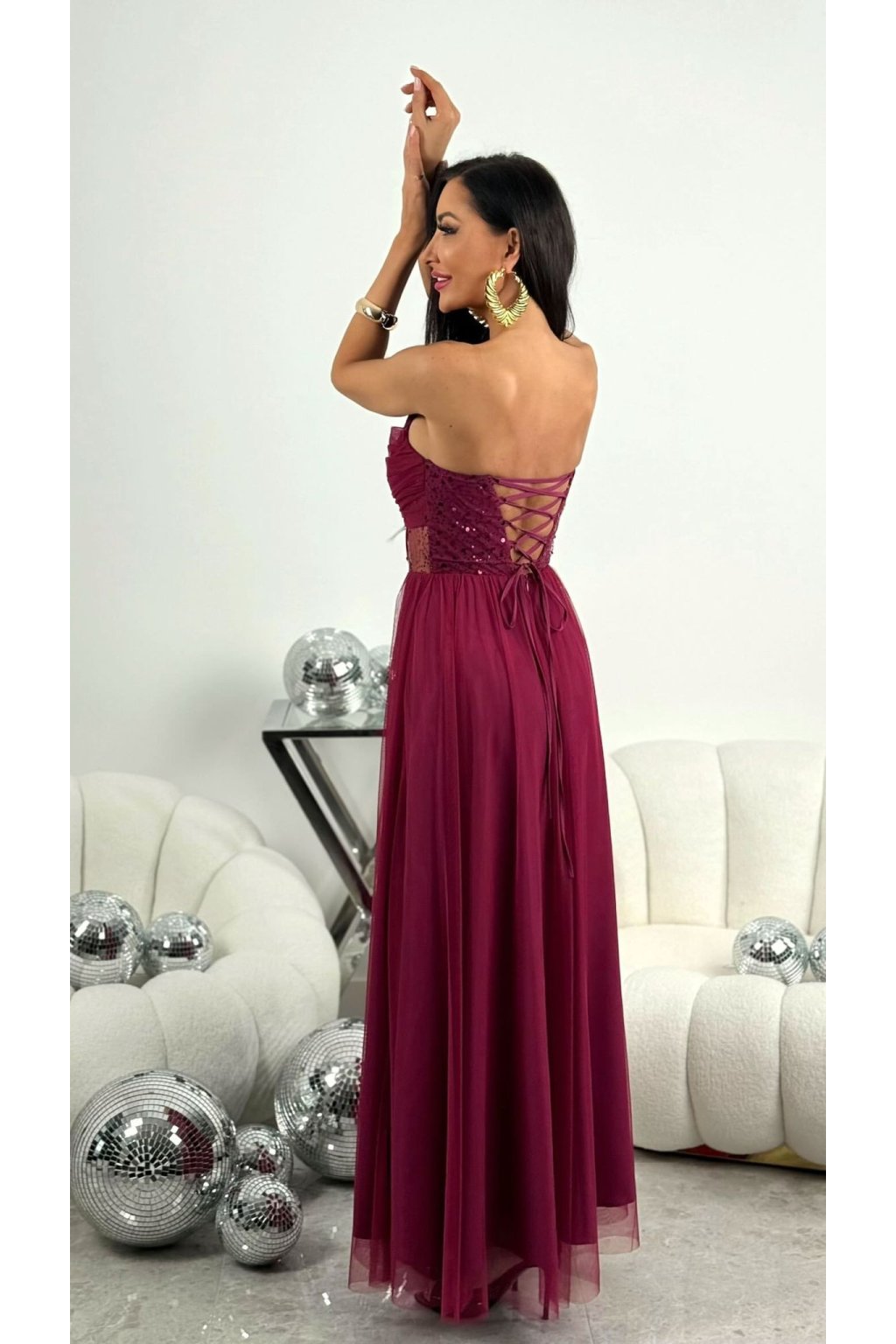 Dlouhé společenské bordó korzetové šaty s tylovou sukní