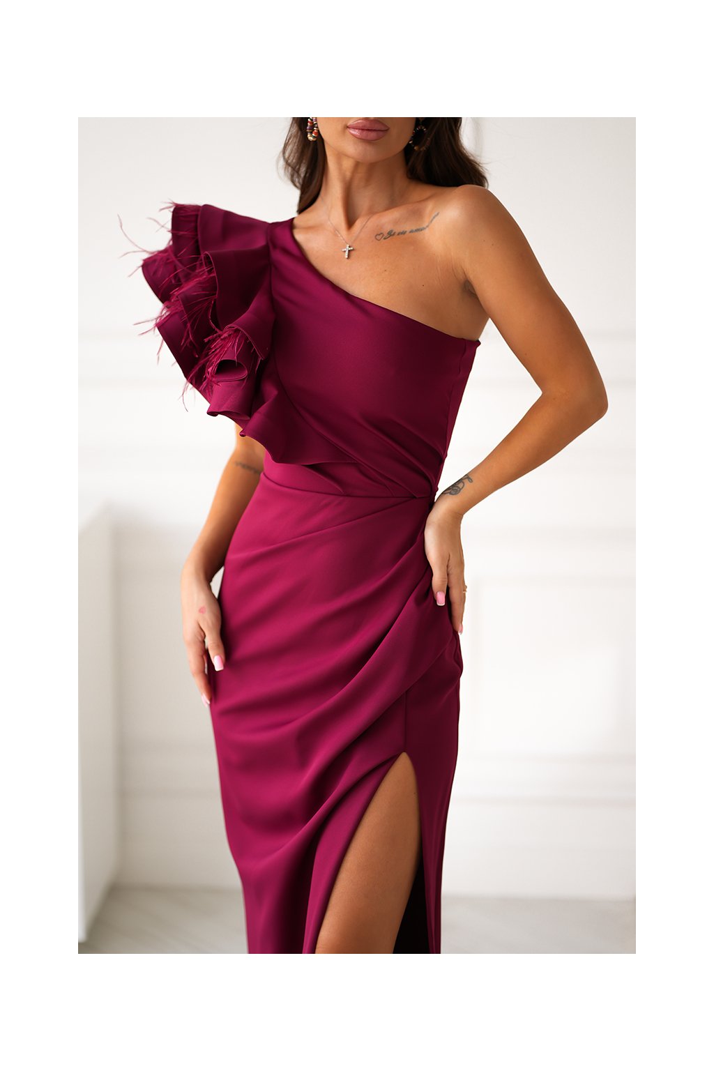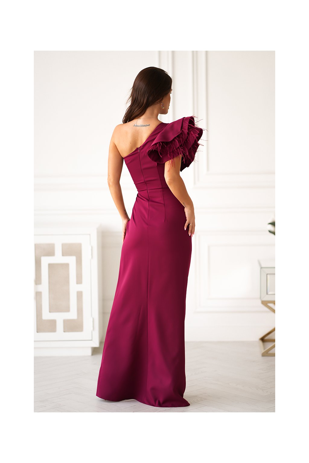 Exkluzivní přiléhavé šaty s dominantním volánem přes jedno rameno vám padnou do oka už na první pohled. Volán je doplněn jemnými pírky. Na prsou nejsou vyztužené. Sukně je přiléhavá a na jedné straně má rozparek. Šaty se zapínají zezadu pomocí zipu.