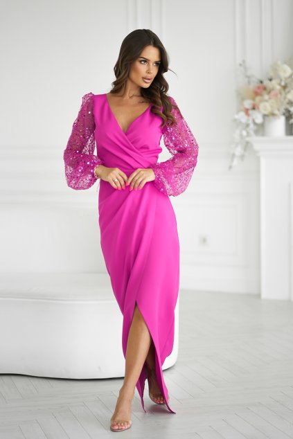 Exkluzivní dlouhé přiléhavé šaty s flitrovými rukávy vám padnou do oka už na první pohled. Výstřih je překládaný, véčkový a na prsou nejsou vyztužené. Dlouhá sukně je na jedné straně rozstřižená. Šaty se zapínají zezadu pomocí zipu.