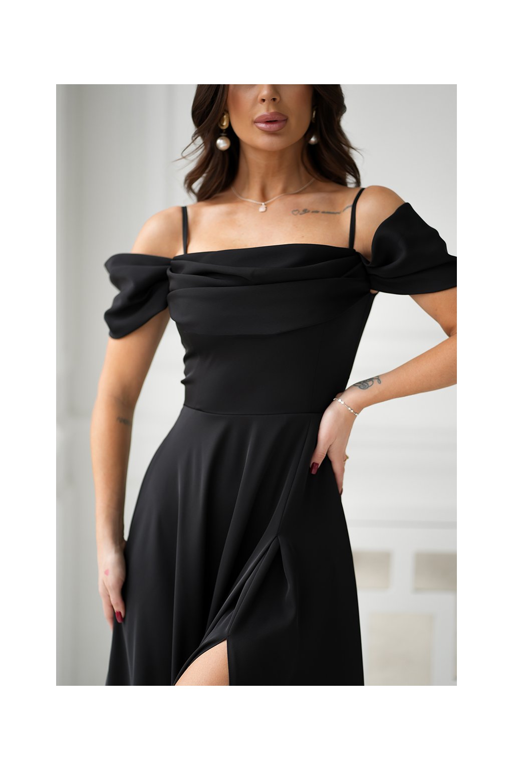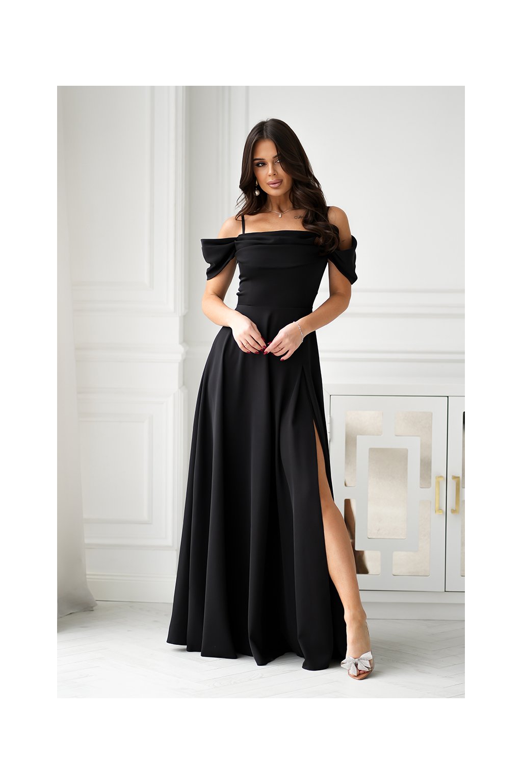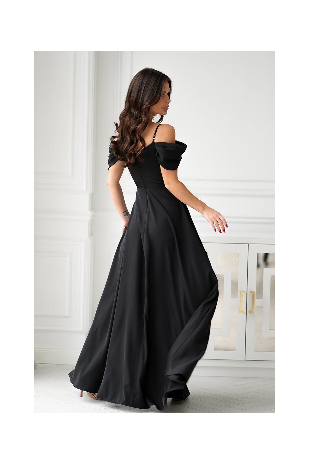 Dlouhé společenské černé šaty s padlými rameny