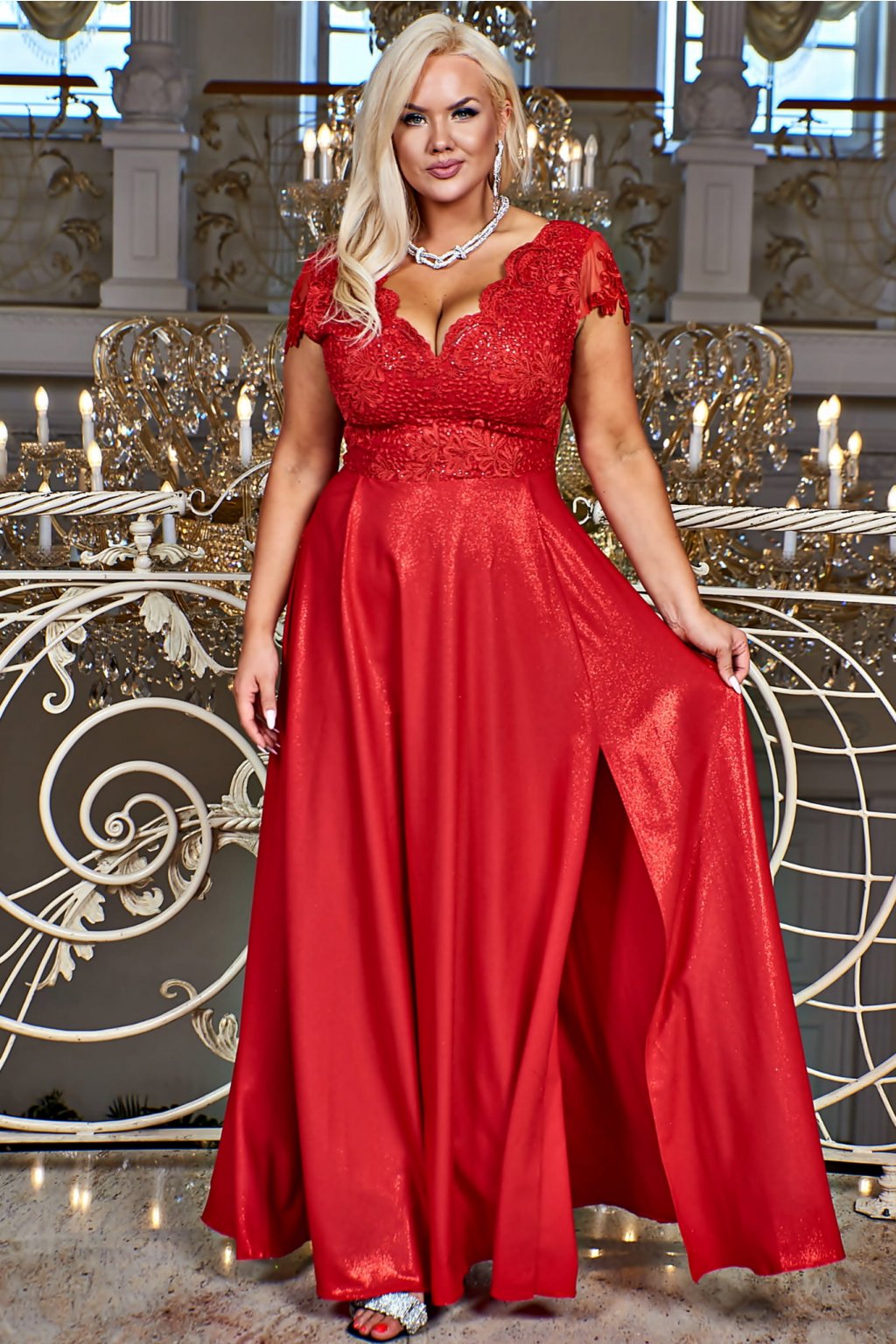 Dlouhé společenské červené krajkové šaty