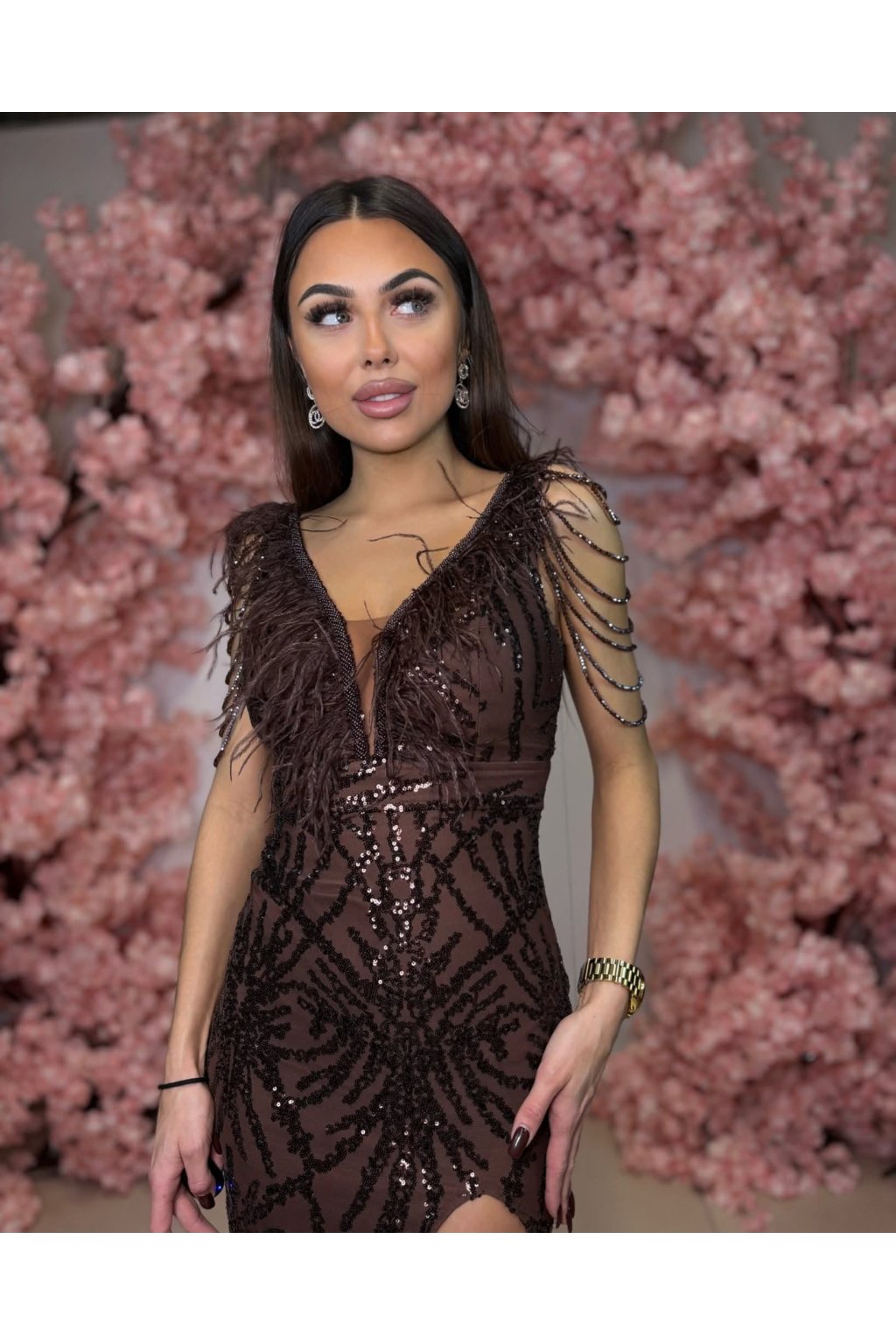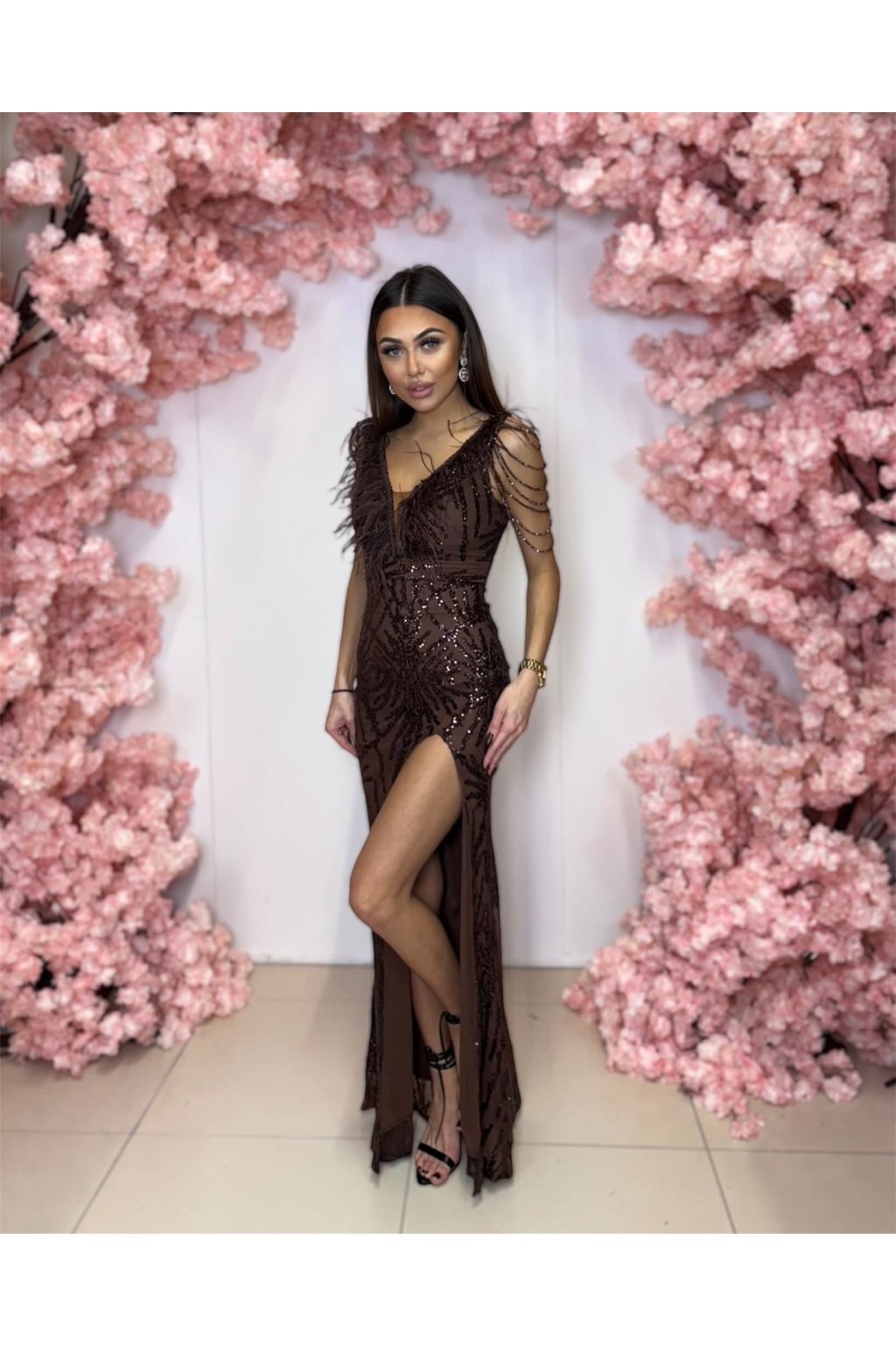 Dlouhé společenské čokoládové šaty s flitry a kamínky