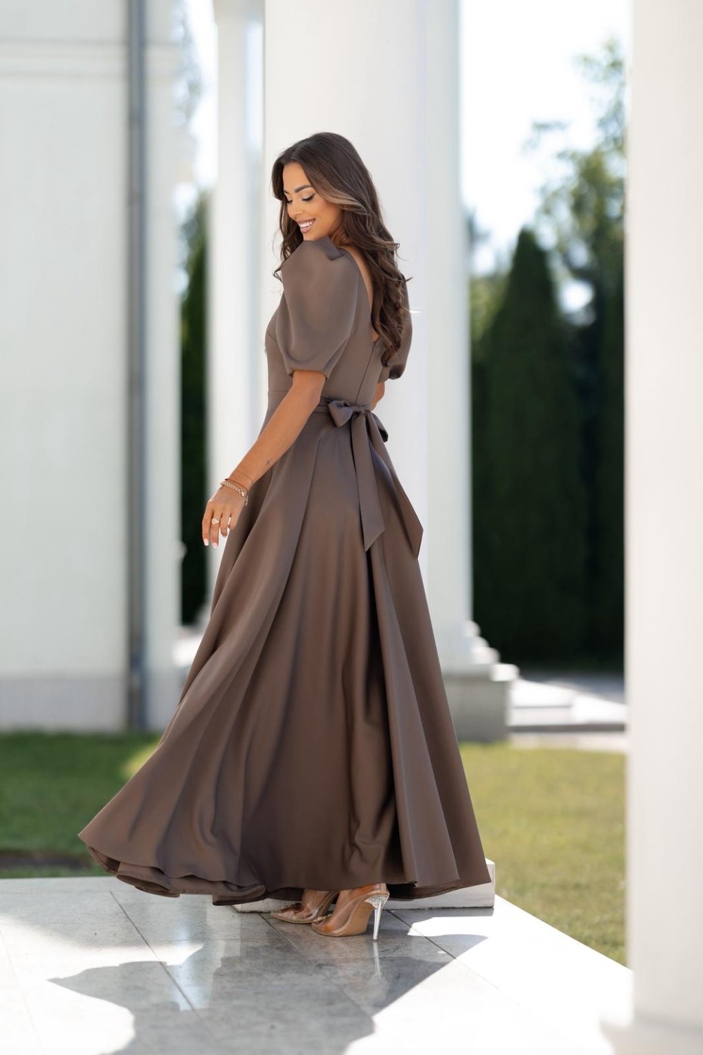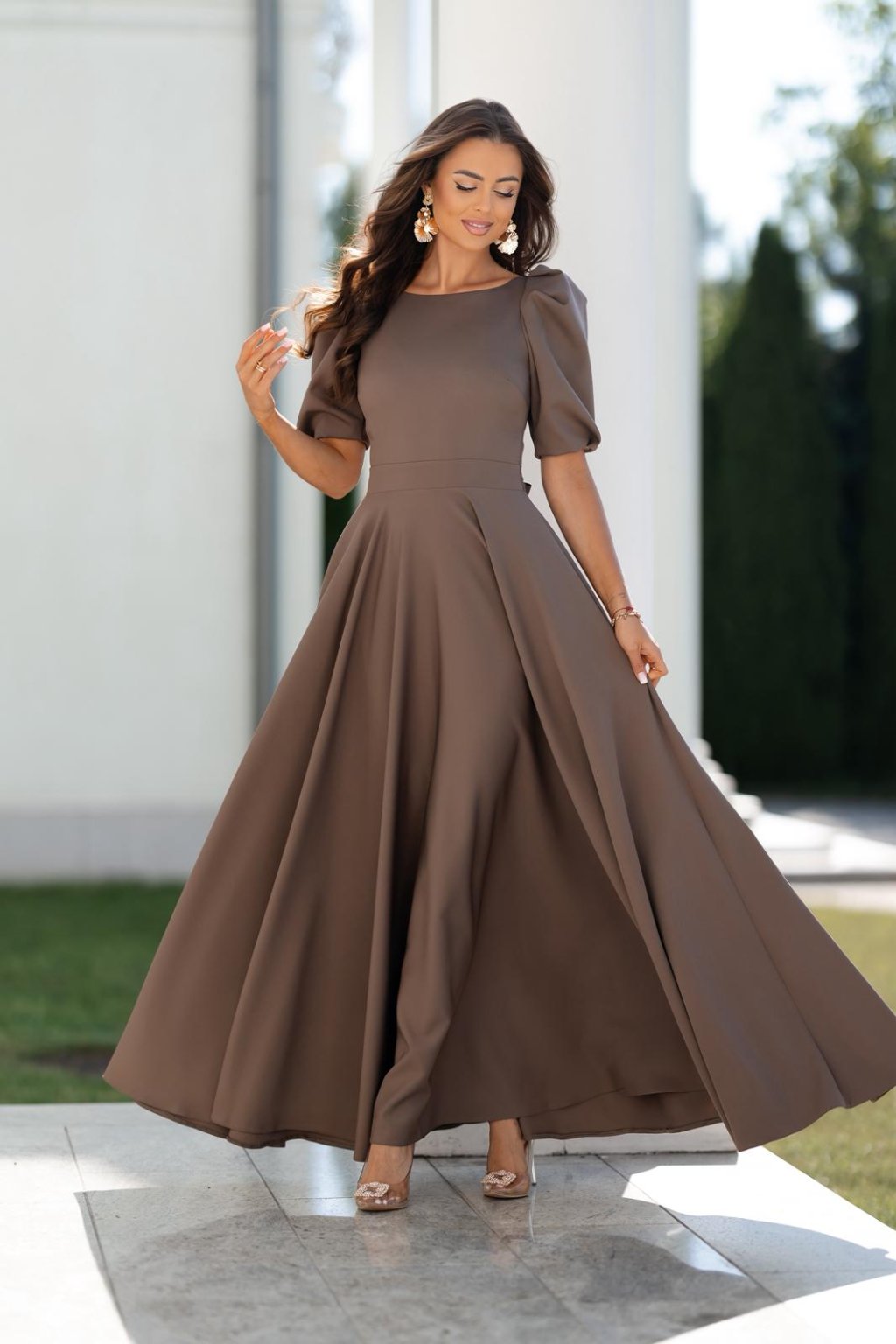 Dlouhé společenské čokoládové šaty s puff rukávy