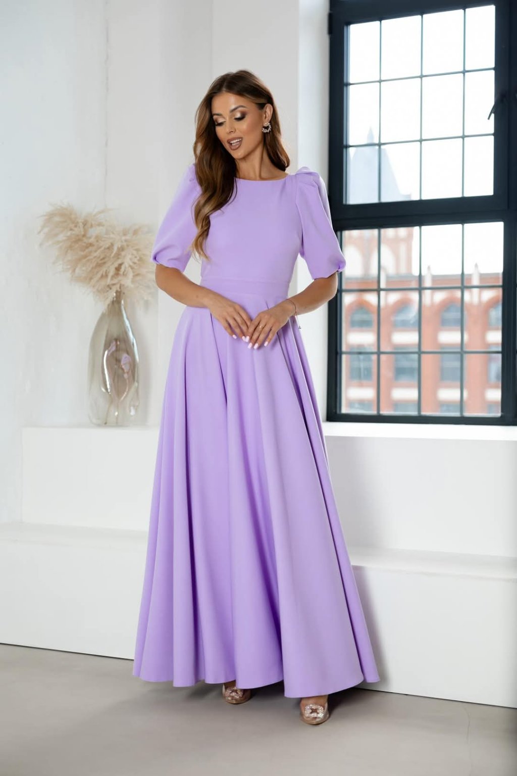 Dlouhé společenské fialové šaty s puff rukávy