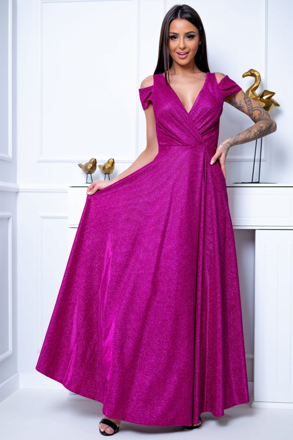 Dlouhé společenské fuchsiovy třpytivé šaty s rozparkem