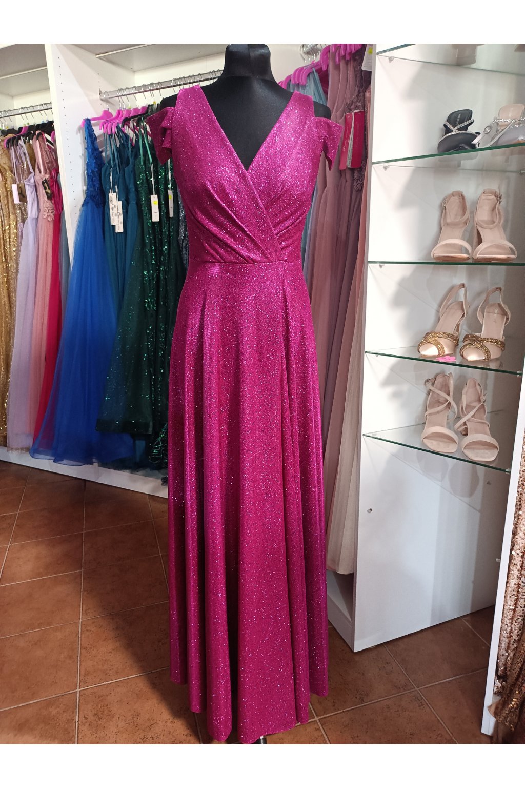 Výjimečné třpytivé šaty na svatbu, ples či jinou důležitou událost. Šaty jsou doplněny třpytkami. Mají překládaný véčkový výstřih a na prsou nejsou vyztužené. Jsou na hrubší ramínka s jemným spadlým rukávem. Hřbet je zakrytý. Sukně je dlouhá, padavá a na jedné straně má rozparek. Zapínají se zezadu na zip.