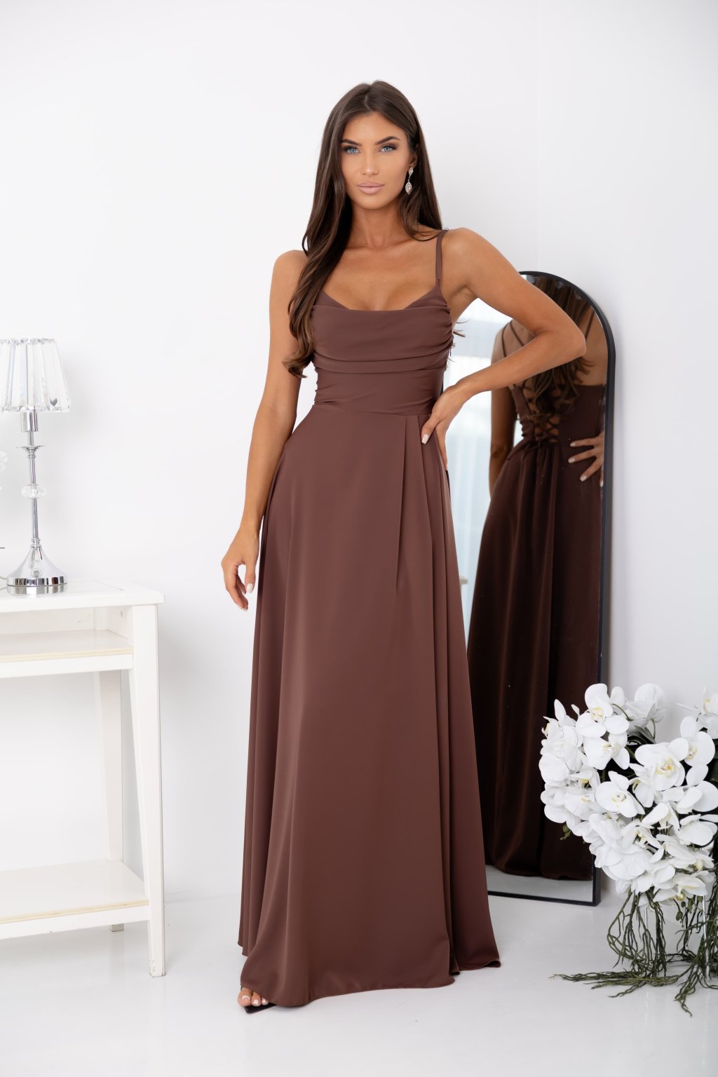 Dlouhé šaty na tenká ramínka v sobě spojují jednoduchost a krásu. Šaty jsou z hladkého, lehkého materiálu. Mají oválný výstřih a na prsou nejsou vyztužené. Sukně je dlouhá, padavá a na jedné straně má rozparek. Na zádech se vážou.