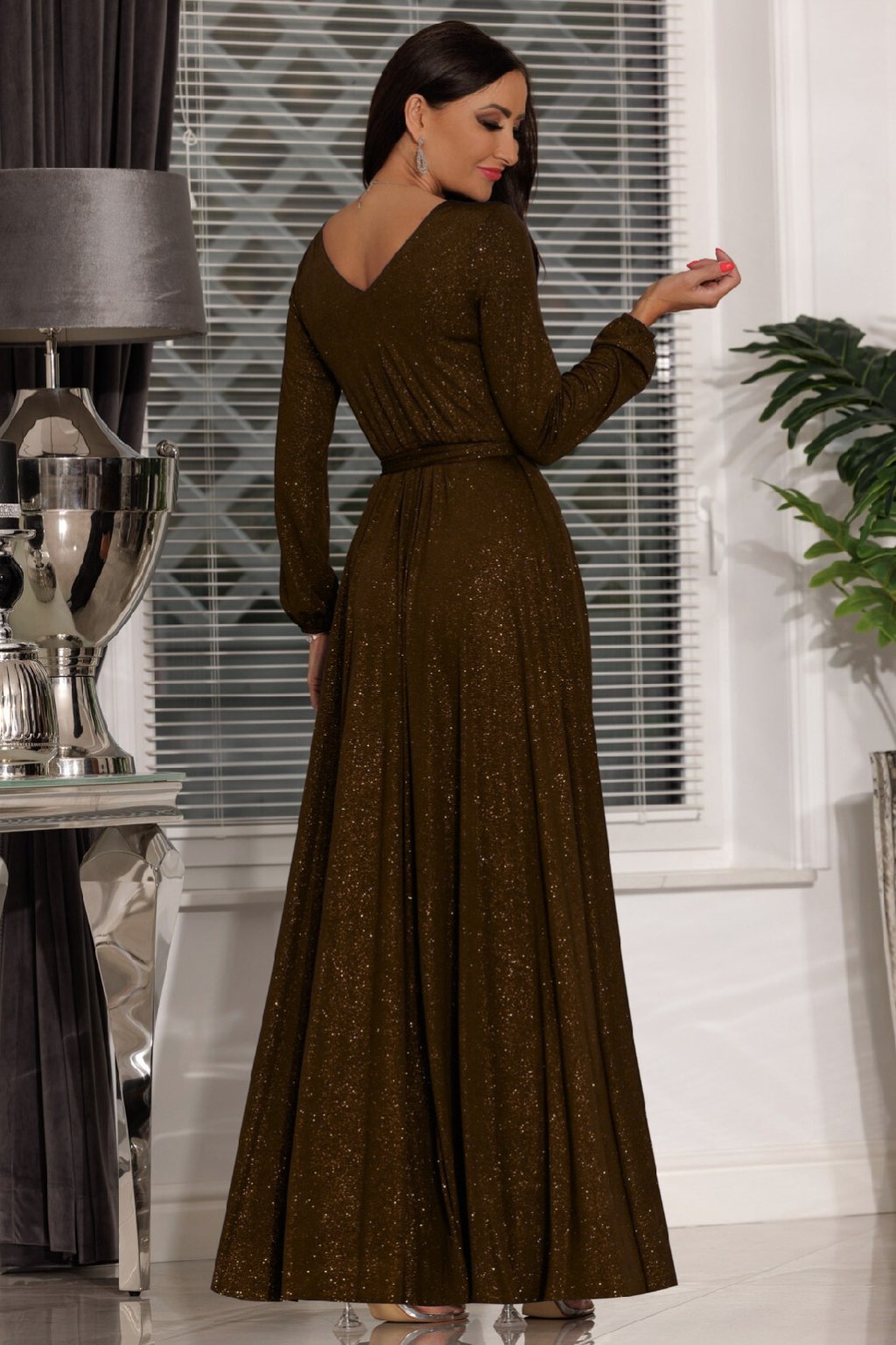 Dlouhé společenské hnědé třpytivé šaty s rukávy