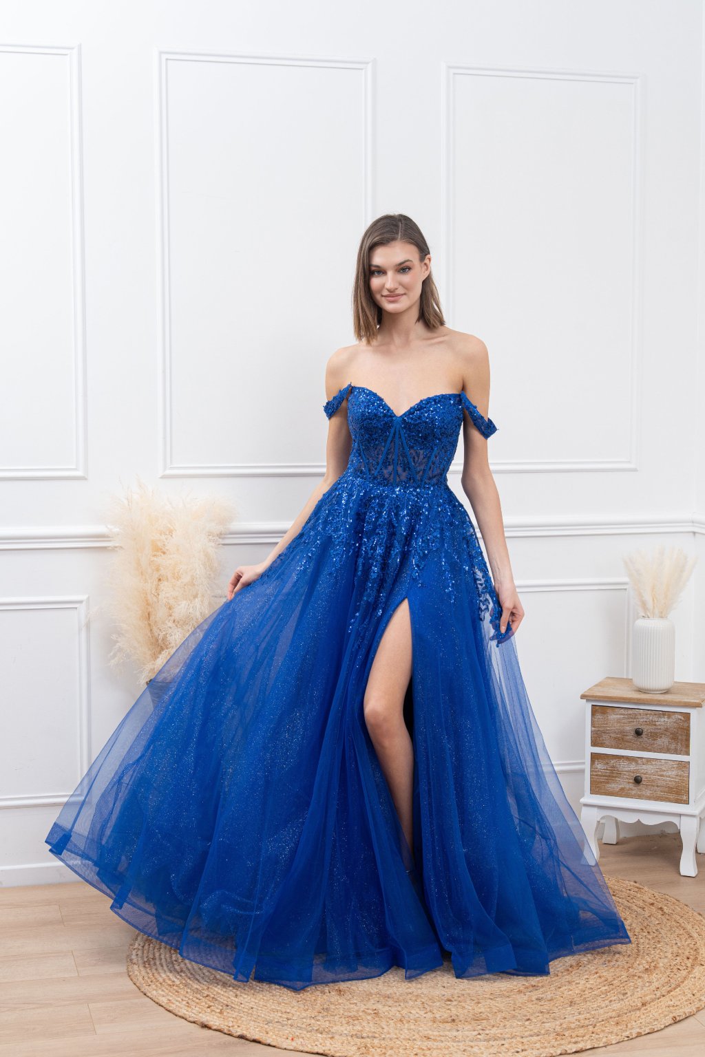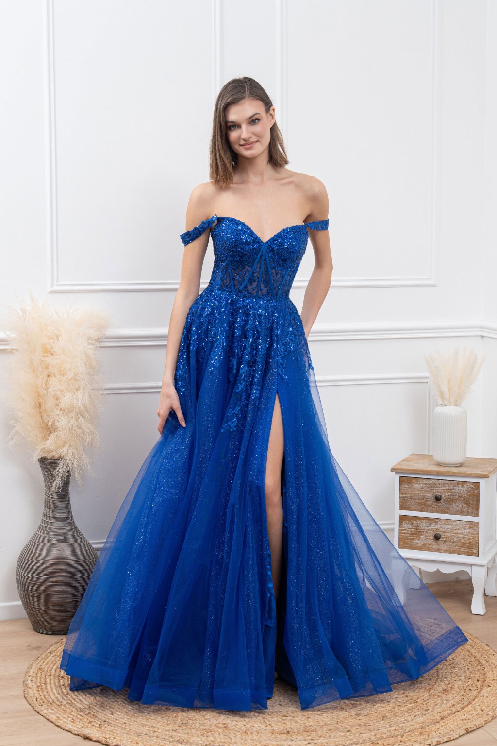Dlouhé společenské královsky modré korzetové šaty s padlými rameny a tylem