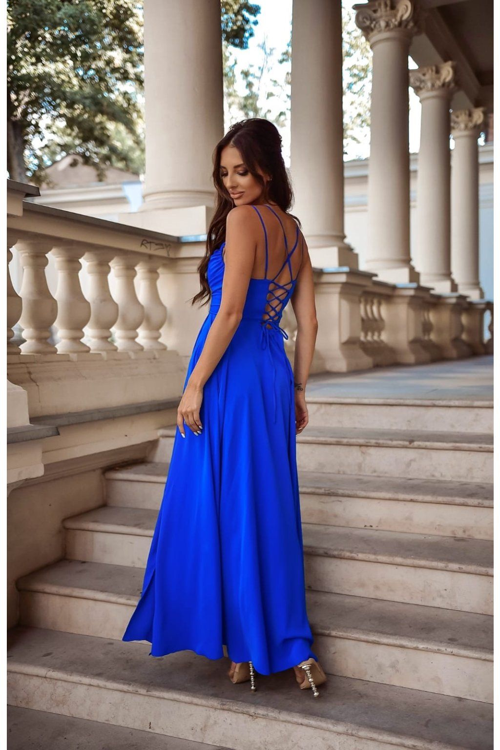 Dlouhé společenské královsky modré šaty s vázáním