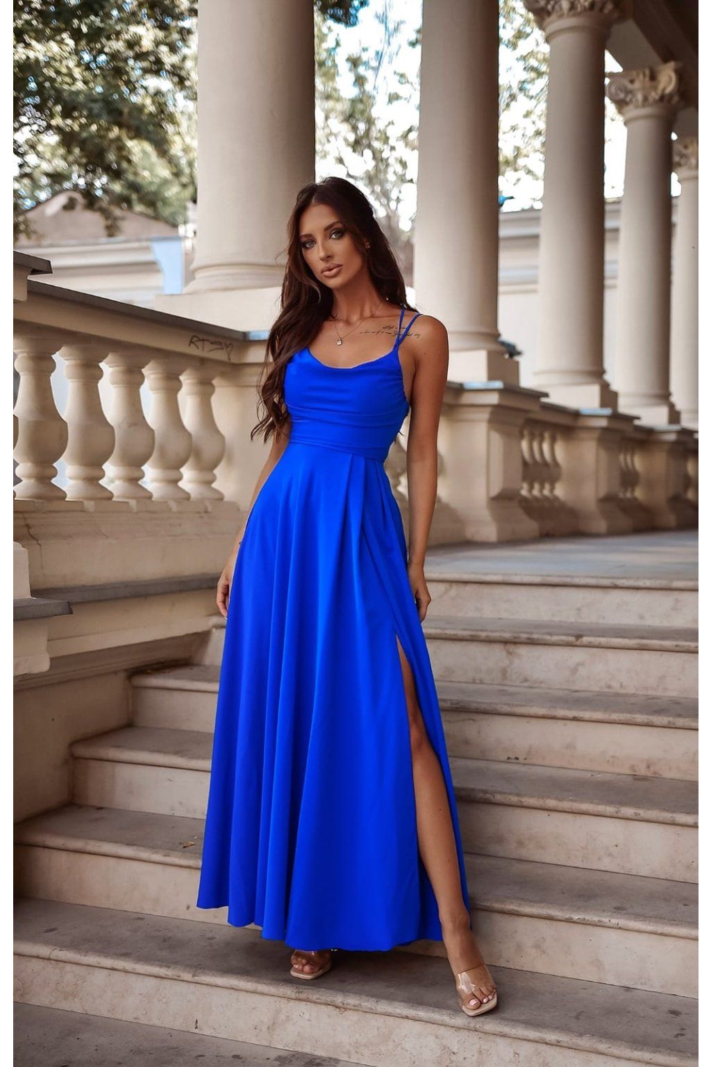 Dlouhé šaty na tenká ramínka v sobě spojují jednoduchost a krásu. Šaty jsou z hladkého, lehkého materiálu. Mají oválný výstřih a na prsou nejsou vyztužené. Sukně je dlouhá, padavá a na jedné straně má rozparek. Na zádech se vážou.