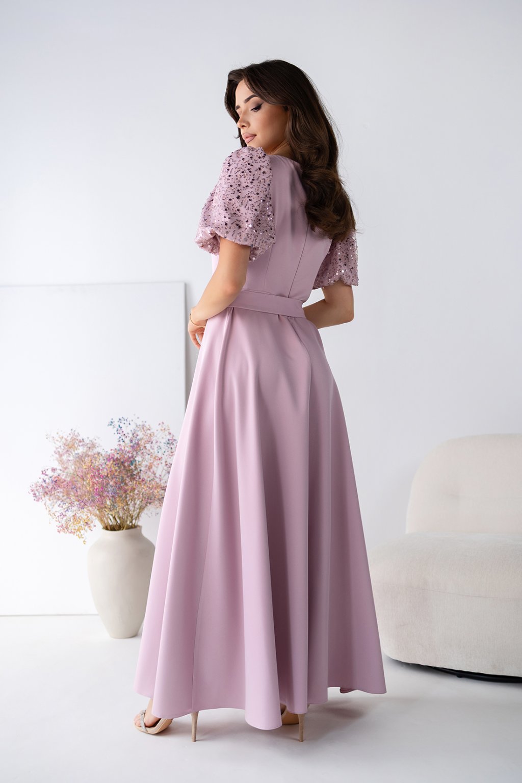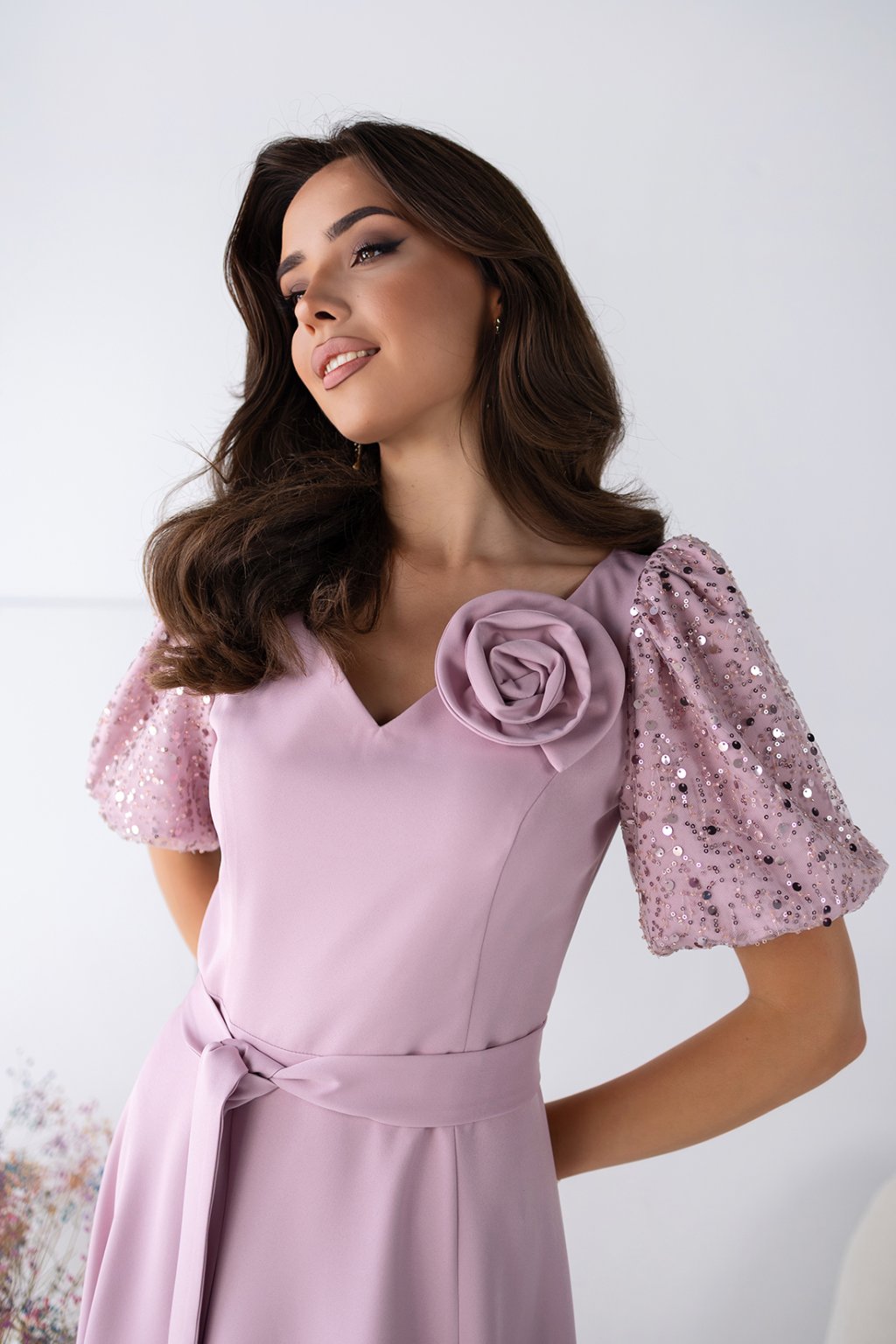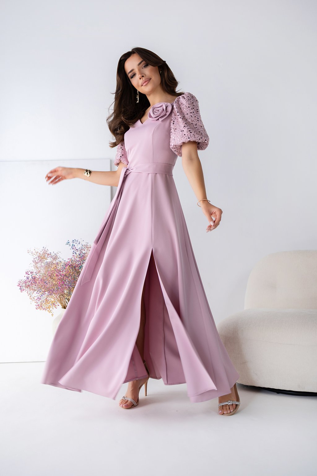 Dlouhé společenské púdrově-růžové šaty s flitrami a květem