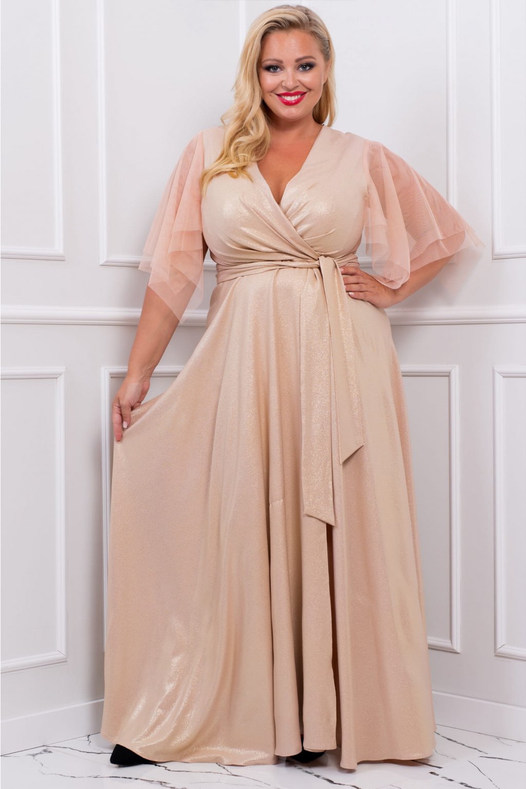 Dlouhé společenské růžovo-zlaté šaty s týlním rukávem