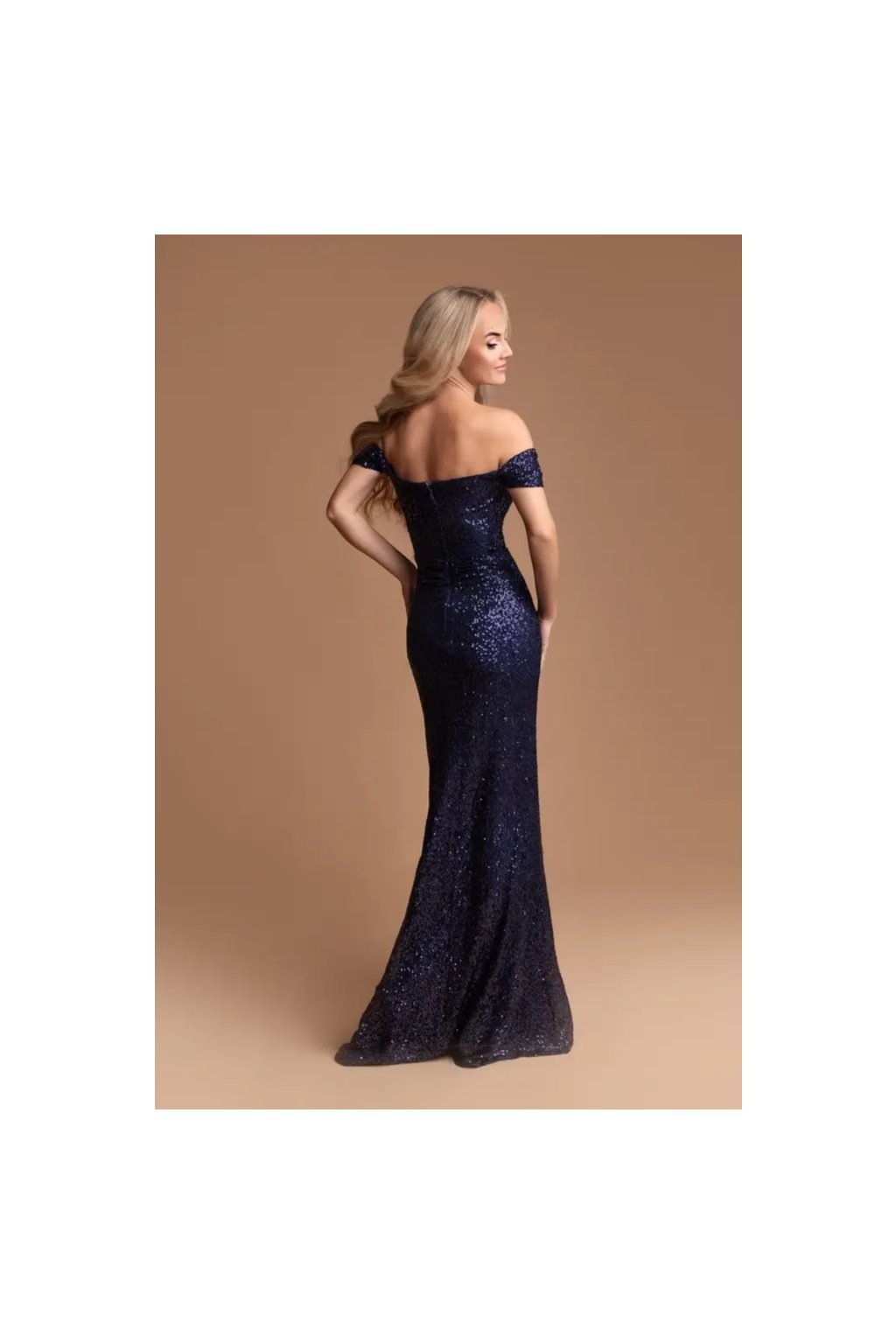 Dlouhé společenské tmavě modré flitrované šaty s padlými rameny