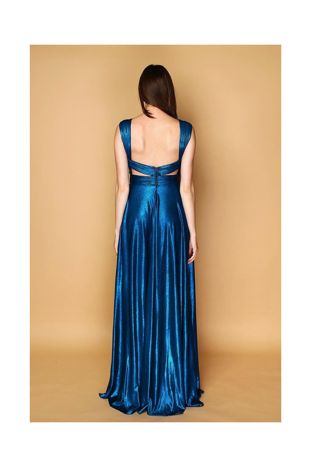 Exkluzivní lesklé šaty jsou skvělou volbou pro plesy, večírky, Silvestr či jinou událost. Vrch šatů má tlustší ramínka, na prsou jsou šaty vyztužené. Dřík je zvýrazněn hrubším pasem. Hřbet je odhalen. Sukně je padavá a na jedné straně má rozparek. Zapínají se zezadu na zip.