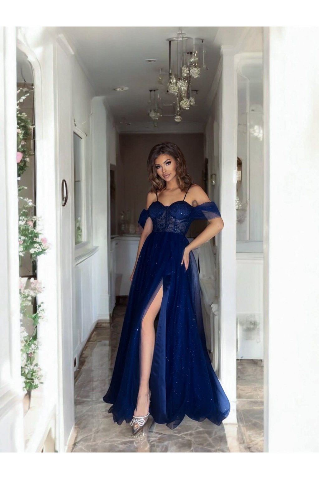 Dlouhé společenské tmavě modré tylové šaty s padlými rameny