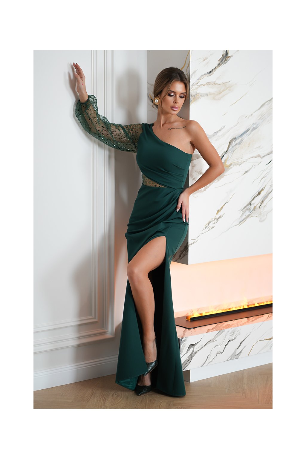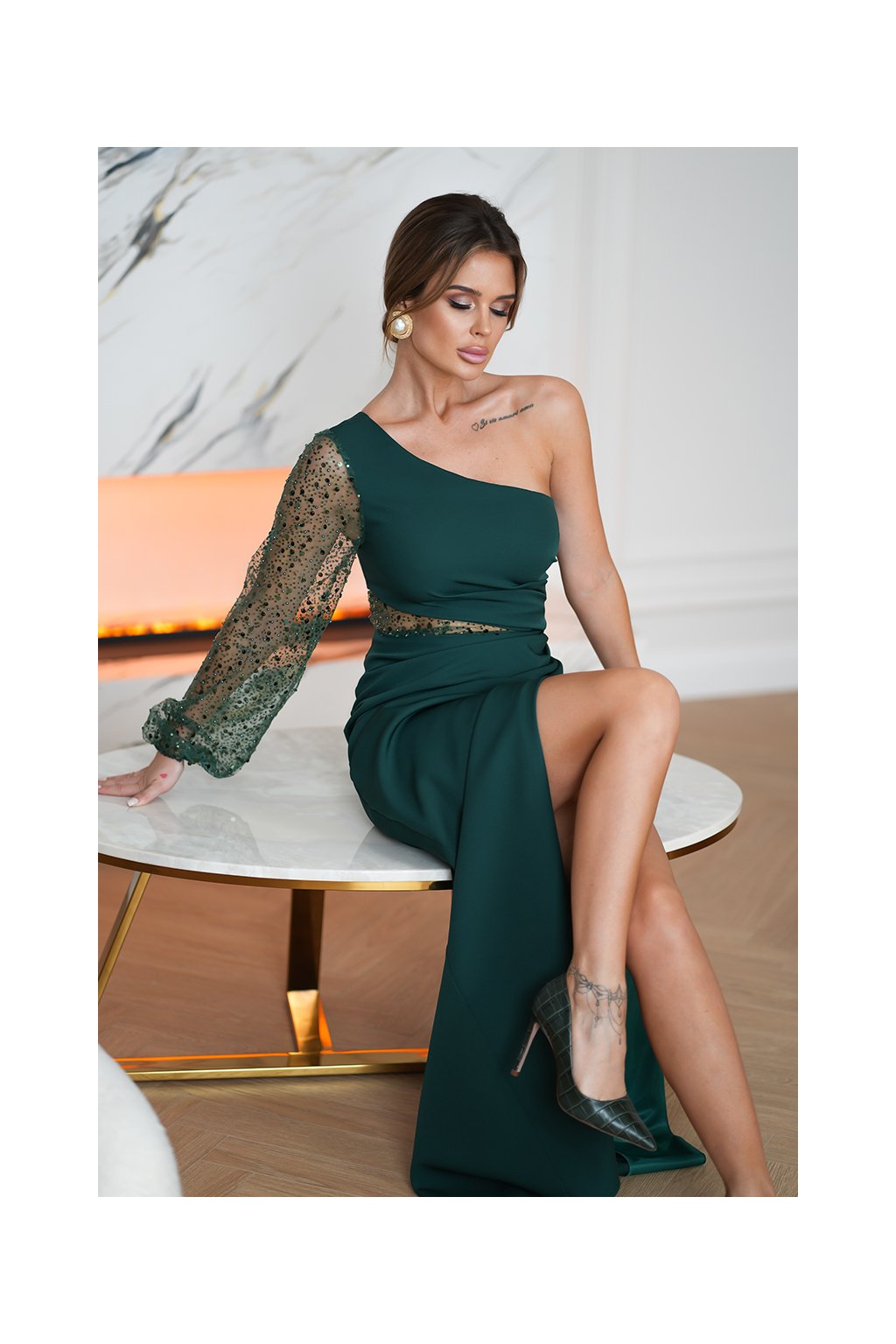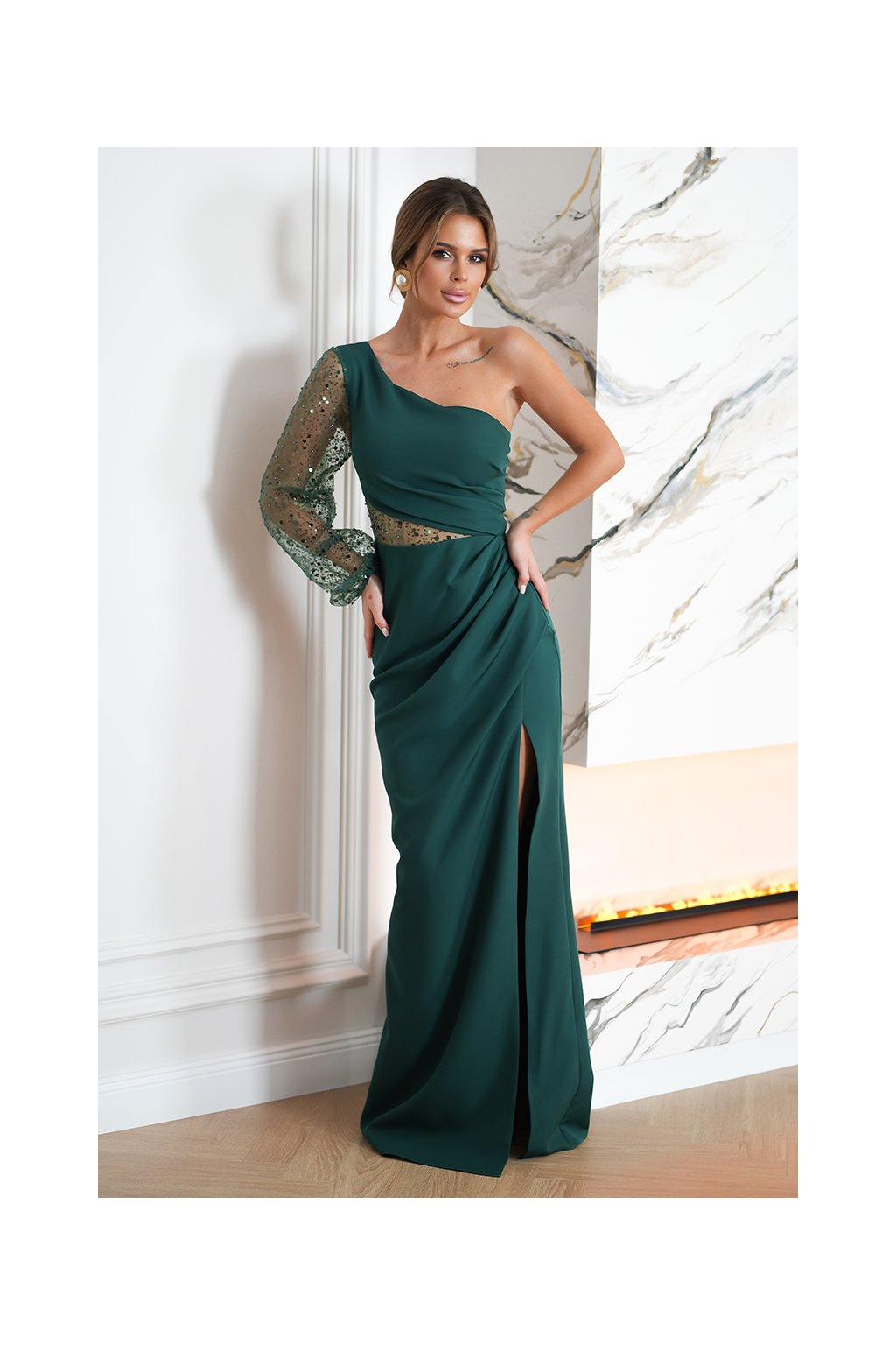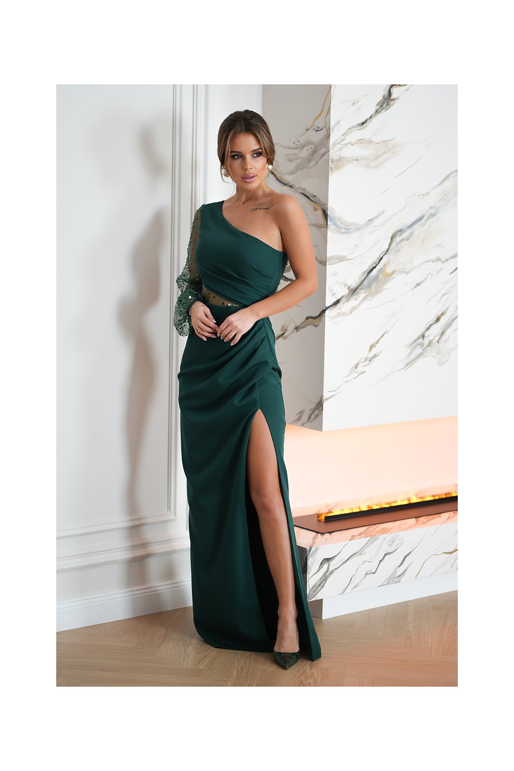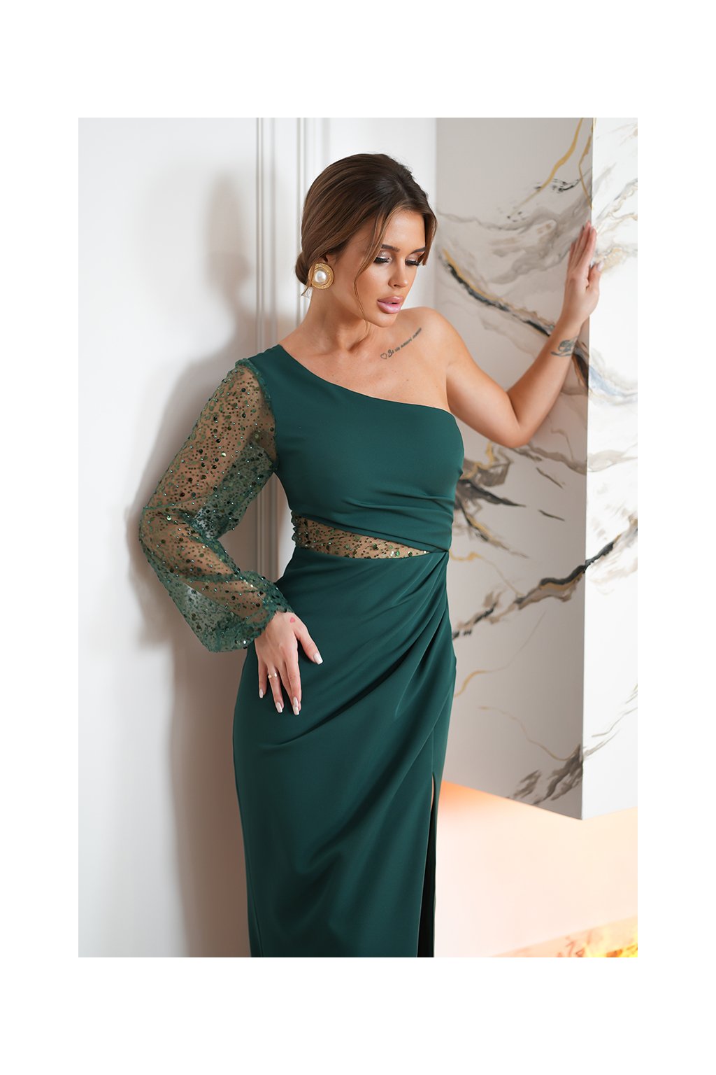 Dlouhé společenské zelené flitrované šaty na jedno rameno