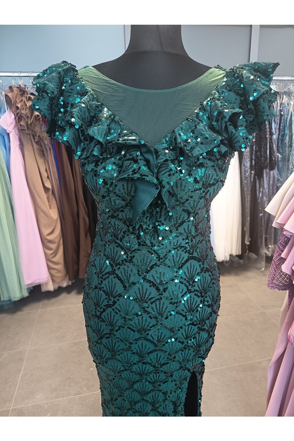 V těchto oslnivých a luxusních šatech budete královnou plesu či jiné události. Díky svému jedinečnému střihu vás nikdo nepřehlédne. Celé šaty jsou z flitrů, pod kterými je měkká podšívka. Výstřih na šatech lemuje jemný volán. Na dekoltu je jemný tyl. Na prsou jsou vyztužené. Sukně je přiléhavá a na jedné straně má rozparek. Na zádech se zapínají na zip.