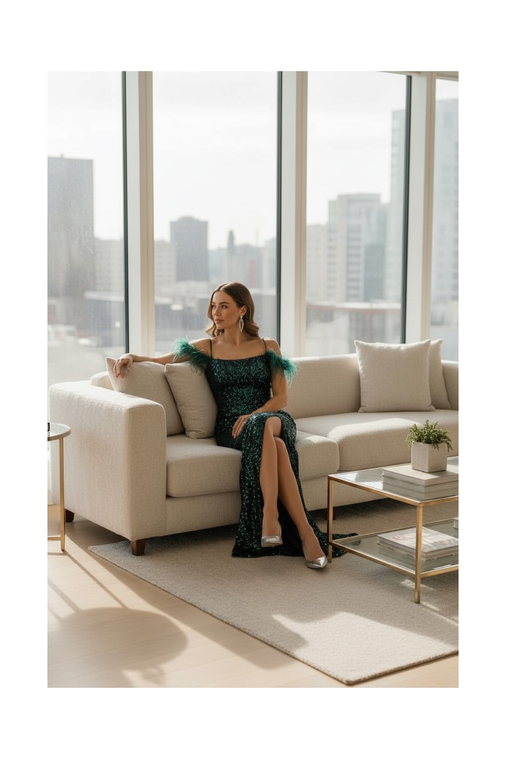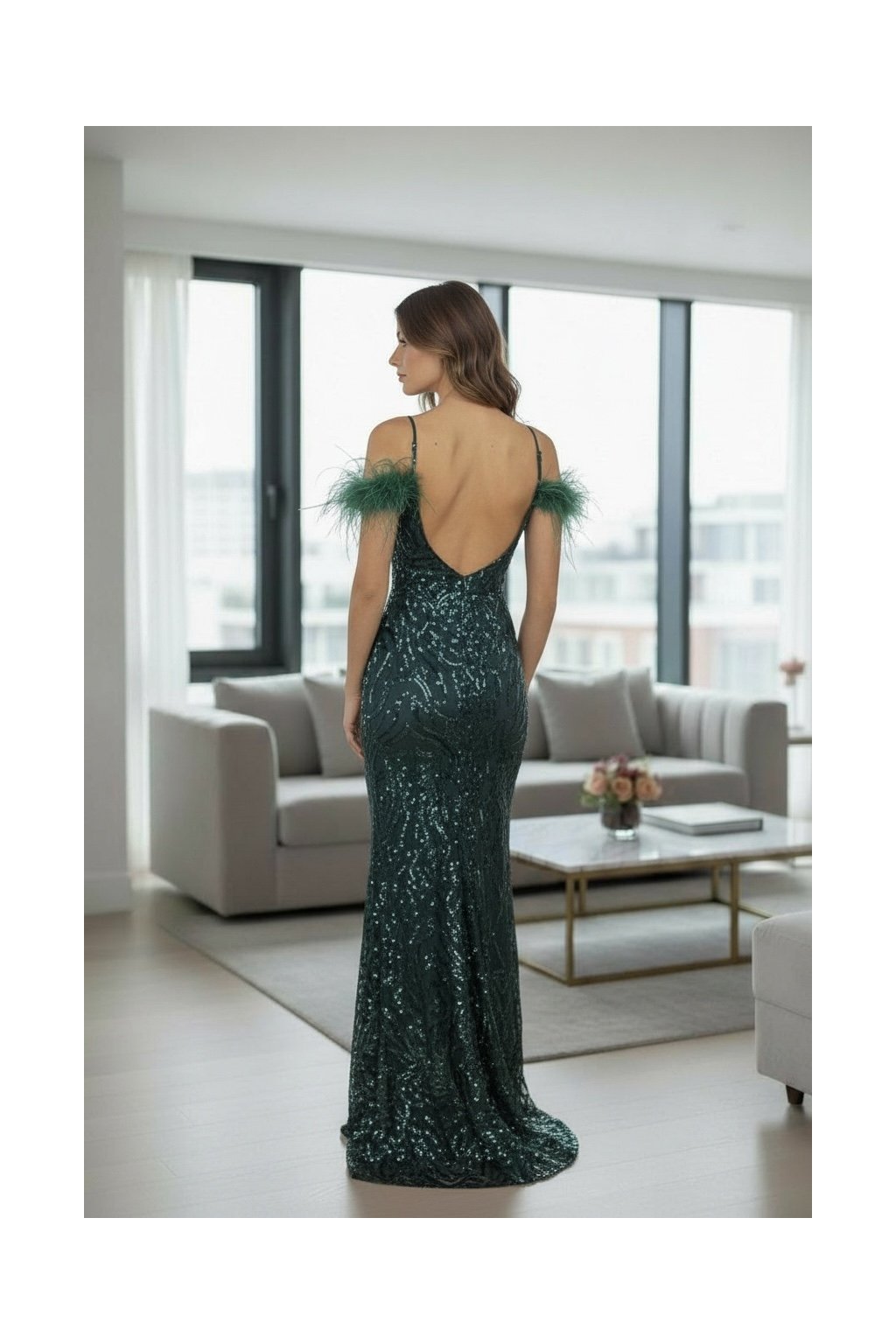 Dlouhé společenské zelené šaty s flitry a peříčky