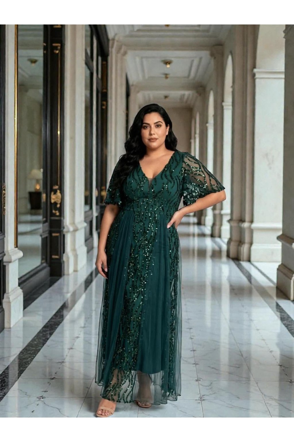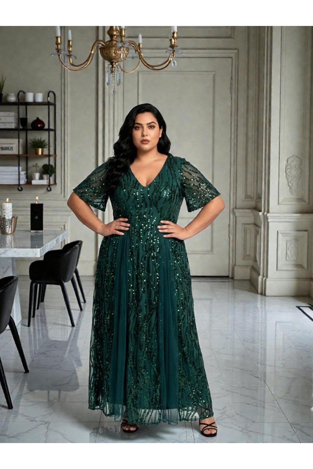 V těchto zářivých flitrovaných šatech přitáhnete na sebe veškerou pozornost! Ať už vás čeká večírek, ples nebo oslava, tyto šaty se hodí na všechno. Šaty mají dvě vrstvy - měkkou podšívku a druhá vrstva je z flitrů. Mají rukáv a vpředu i vzadu mají véčkový výstřih. Na prsou jsou šaty vyztužené. Sukně je přiléhavá a doplněná tylem. Zapínají se zezadu na zip.