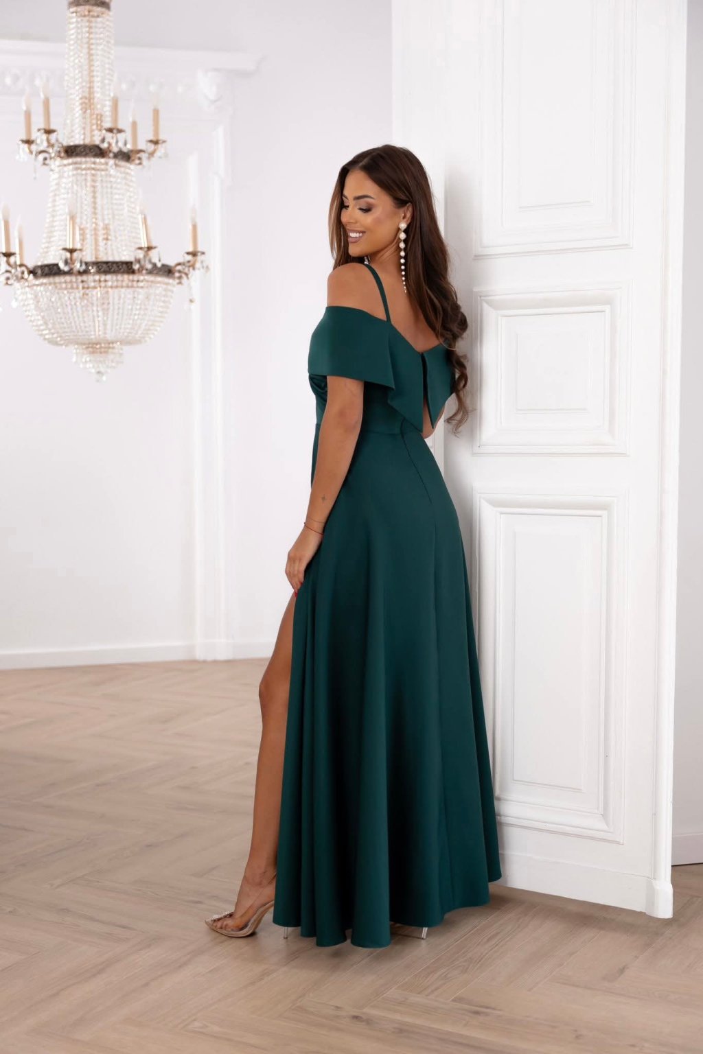 Okouzlující hladké šaty s padlými rameny v sobě spojují jednoduchost a krásu. Šaty jsou na tenká ramínka a na prsou nejsou vyztužené. Sukně je dlouhá, padavá a na jedné straně má rozparek. Na zádech se zapínají na zip.