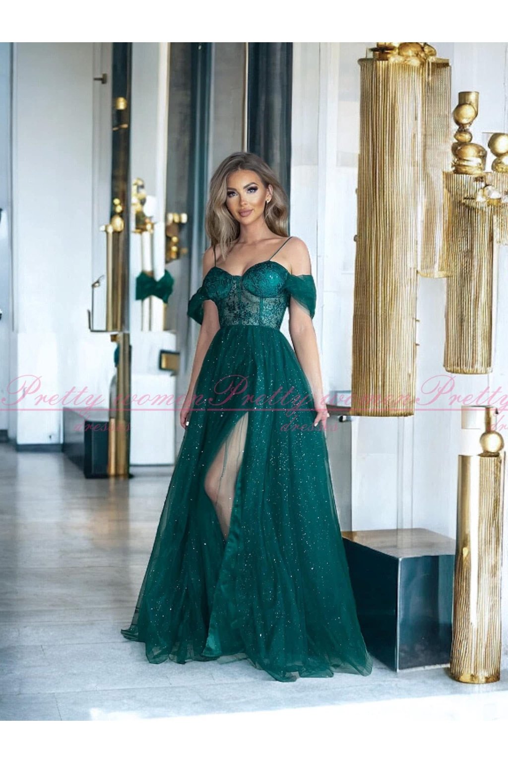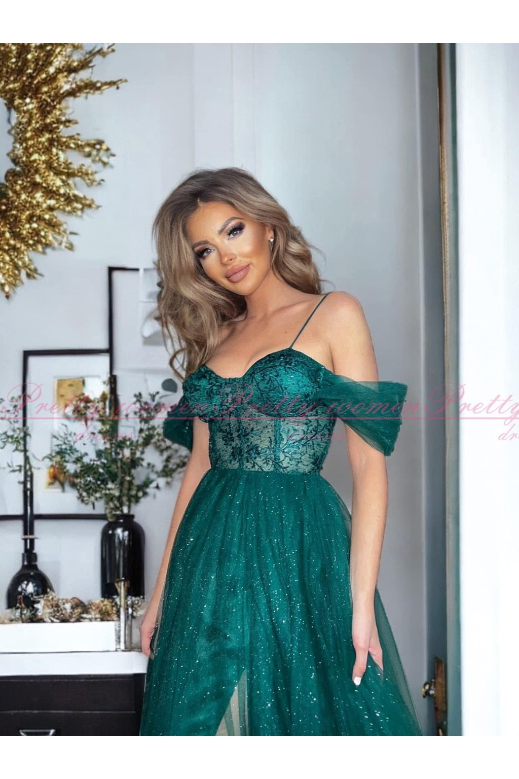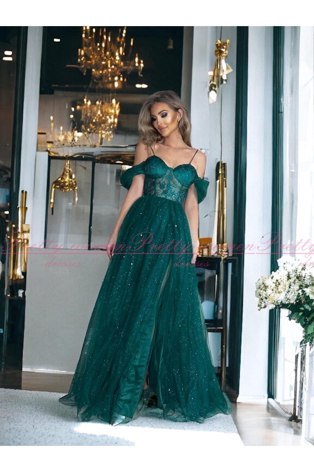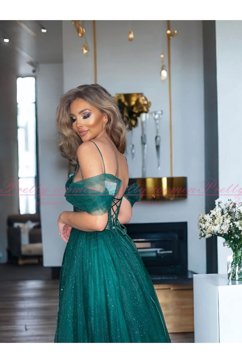 Dlouhé společenské zelené tylové šaty s padlými rameny