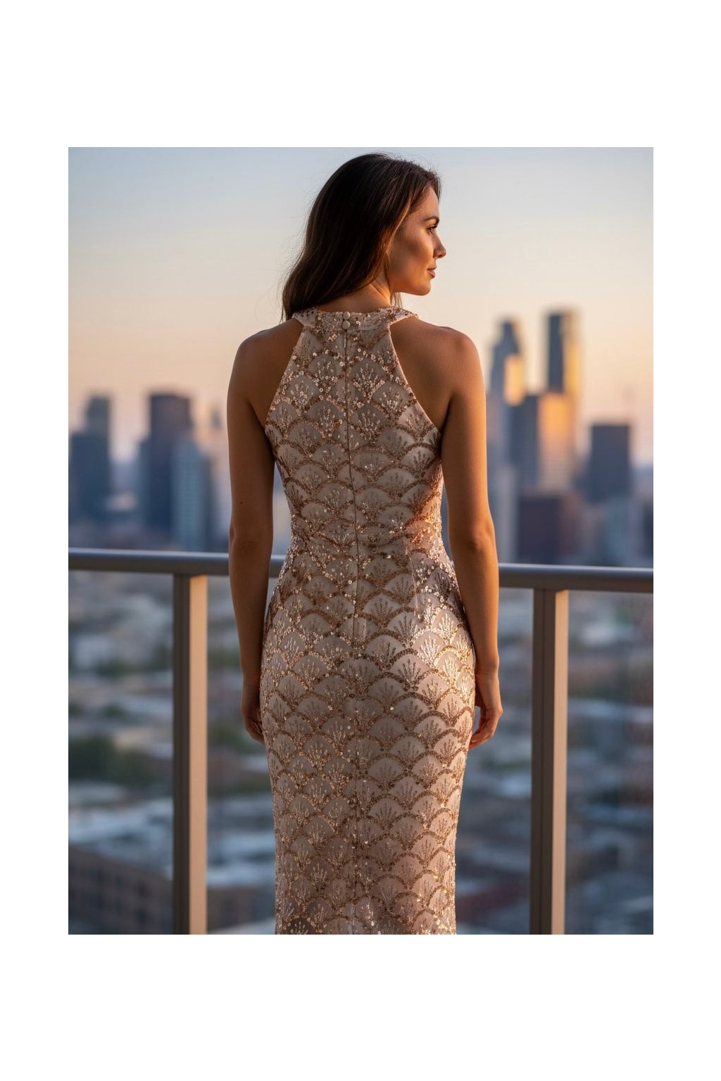 Exkluzivní dlouhé přiléhavé šaty vám padnou do oka už na první pohled. Šaty jsou zdobeny jemnými flitry. Výstřih je hluboký, véčkový, překrytý tylem a jemnými kamínkovými řetízky. Na prsou jsou vyztužené. Dlouhá sukně je přiléhavá. Hřbet je zakrytý. Šaty se zapínají zezadu pomocí zipu a dvou knoflíčků za krkem.