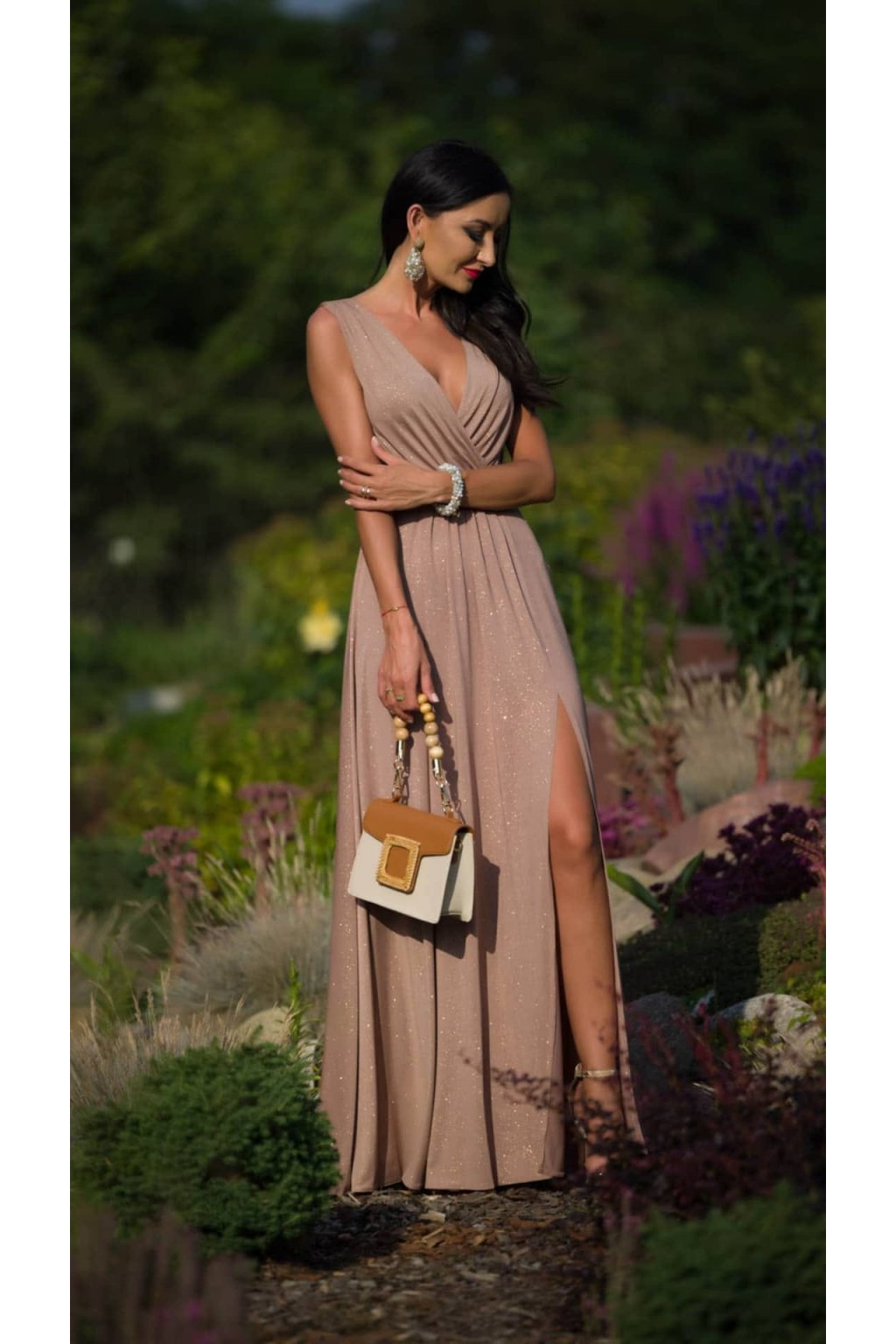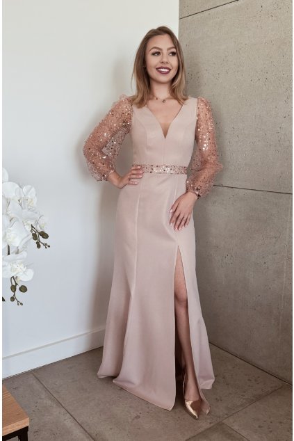 Exkluzivní dlouhé šaty s třpytkami vás udělají jedinečnou a nepřehlédnutelnou, ať už na svatbě nebo jiné události. Horní část šatů je na silnější ramínka. Výstřih šatů je lemovaný výstřihem do V s jemným volánkem. Sukně je dlouhá, spadající a na jedné straně má rozparek. K šatům jsou dva pásky, jeden v barvě šatů a druhý v černé barvě. Šaty jsou elastické, protože v pase je pružný pásek. Nezapínají se na zip.