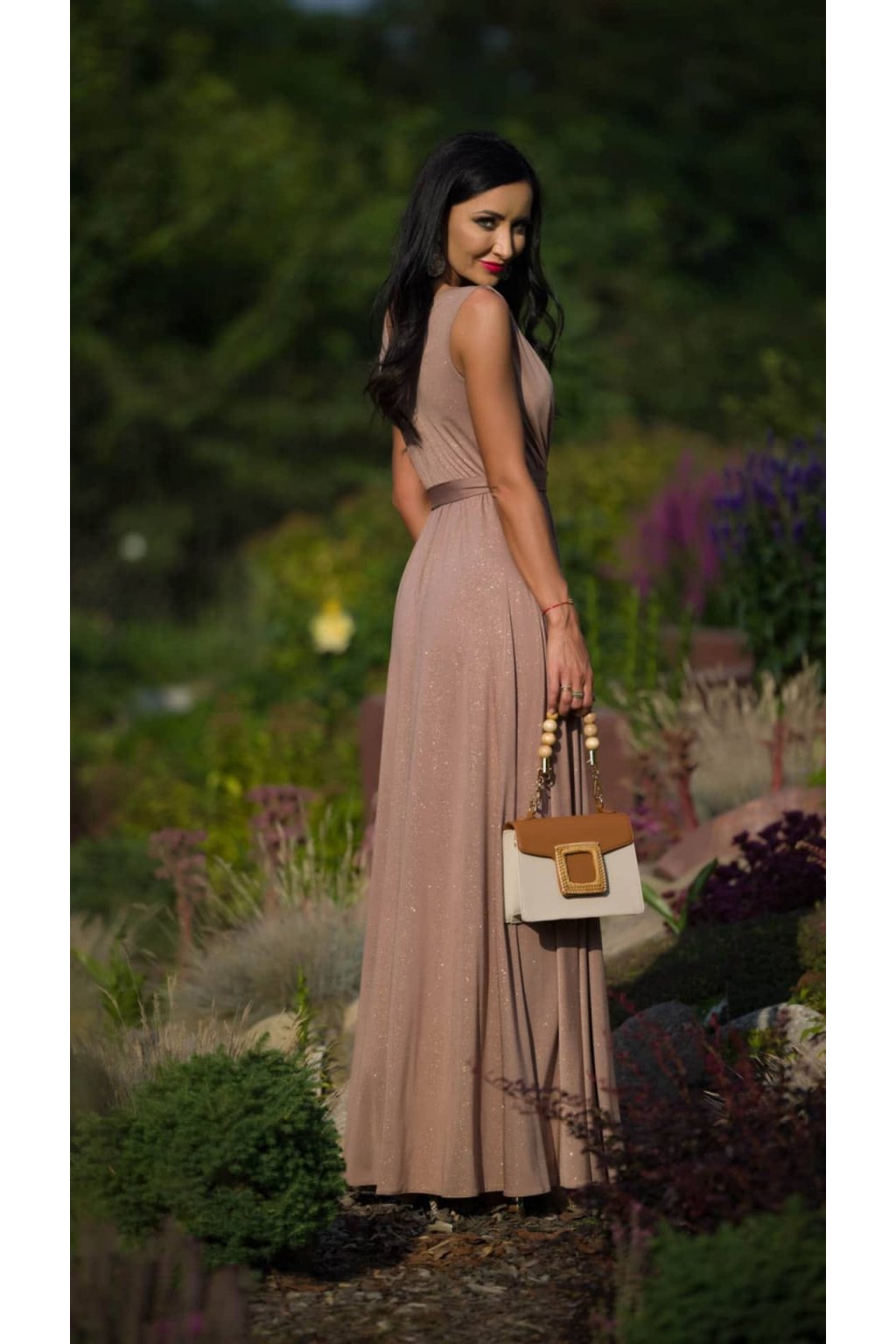Exkluzivní dlouhé šaty s třpytkami vás udělají jedinečnou a nepřehlédnutelnou, ať už na svatbě nebo jiné události. Horní část šatů je na silnější ramínka. Výstřih šatů je lemovaný výstřihem do V s jemným volánkem. Sukně je dlouhá, spadající a na jedné straně má rozparek. K šatům jsou dva pásky, jeden v barvě šatů a druhý v černé barvě. Šaty jsou elastické, protože v pase je pružný pásek. Nezapínají se na zip.
