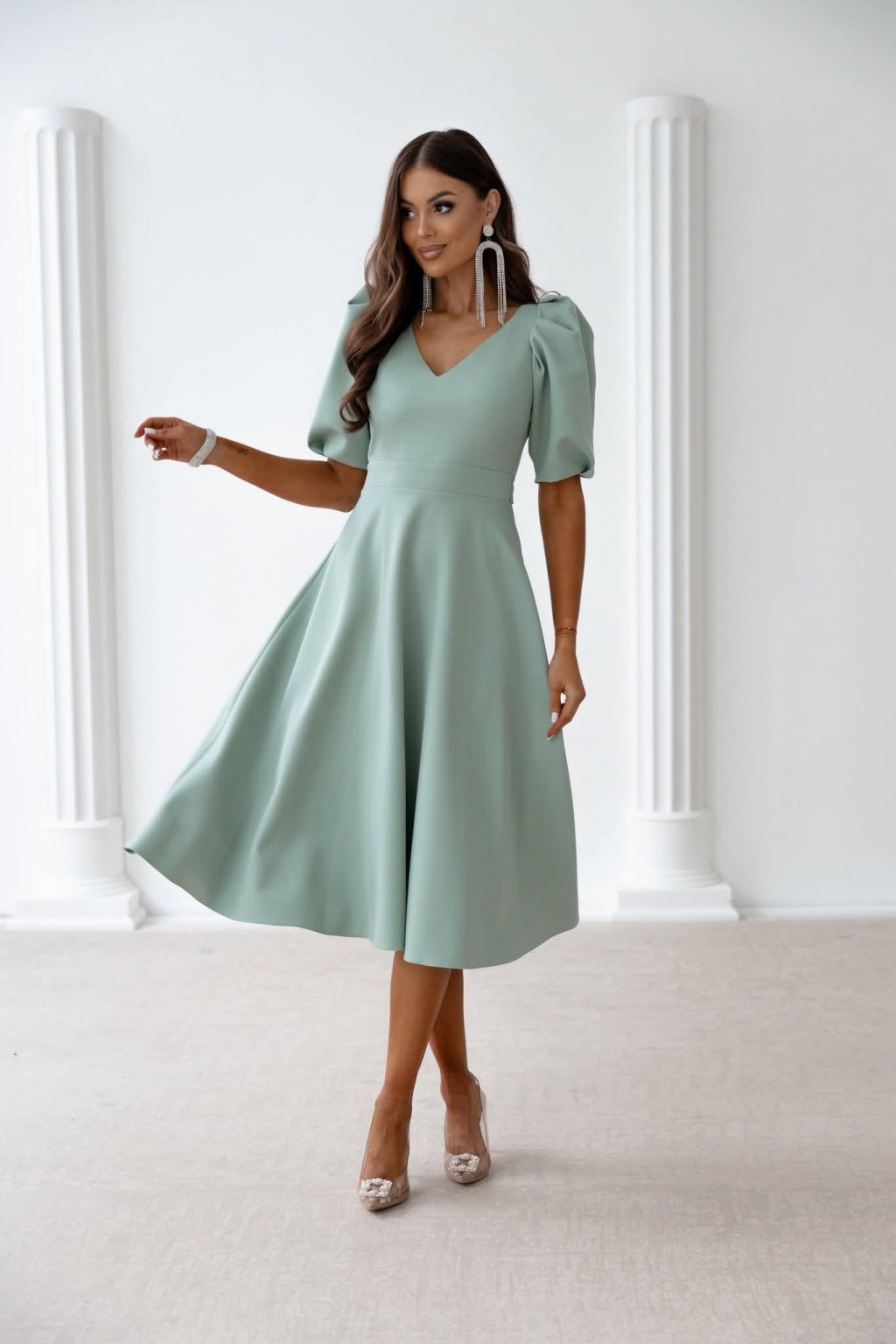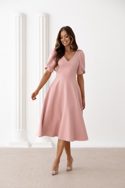 Vsaďte na jednoduchost a styl. Tyto jedinečné midi šaty jsou stvořeny pro řadu příležitostí. Díky trendy puff rukávům jsou šaty nepřehlédnutelné. Na prsou nejsou vyztužené. Vzadu na zádech mají jemný véčkový výstřih. Sukně je padavá. Zapínají se zezadu na zip. K šatům je na pevně připojen opasek.