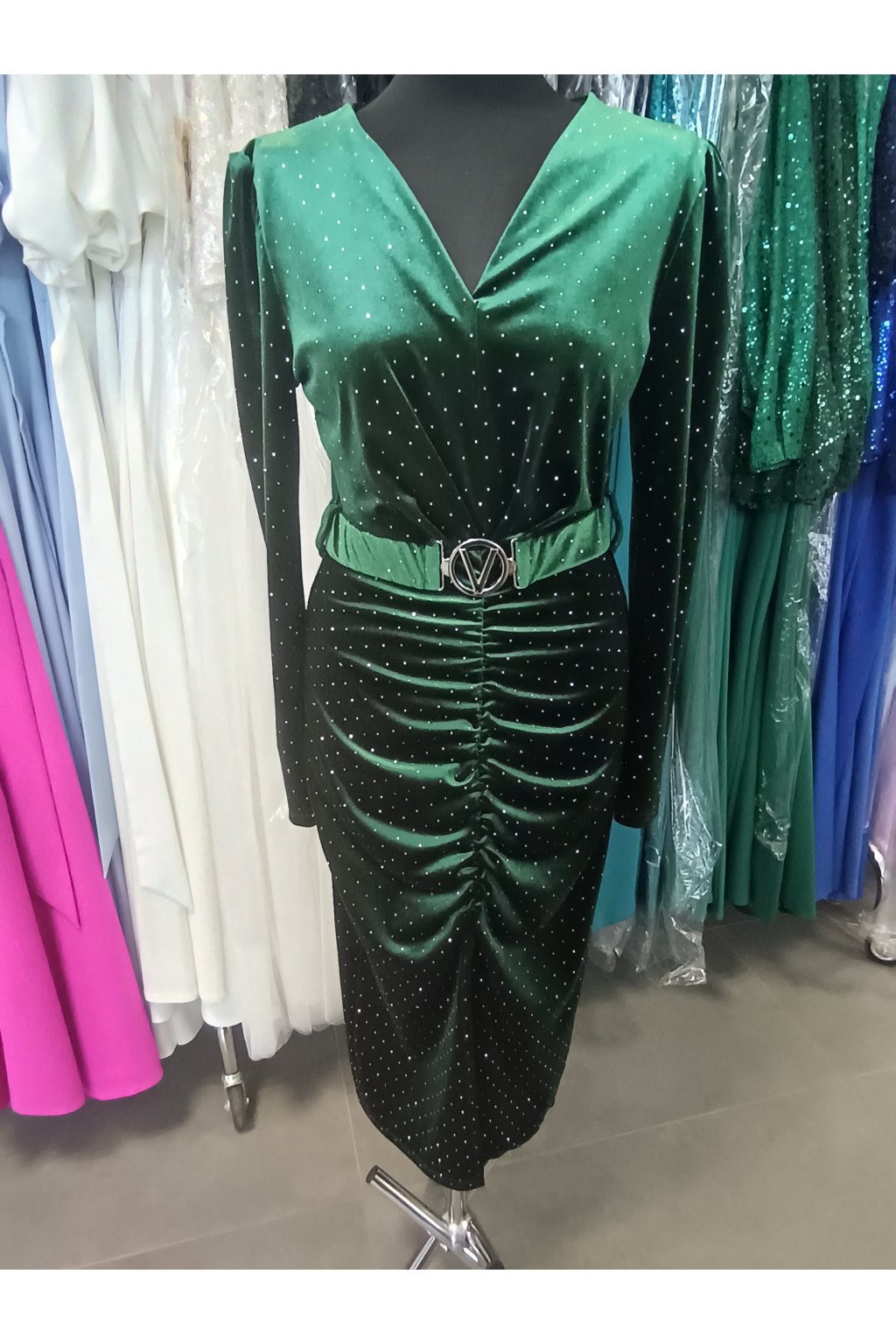 Nádherné sametové šaty doplněné kamínky. Mají dlouhý rukáv a přes bříško řasení. Na sukni je vpředu rozparek. K šatům je opasek. Okouzlující šaty na Vánoce, vánoční večírek, do práce či na jinou příležitost.