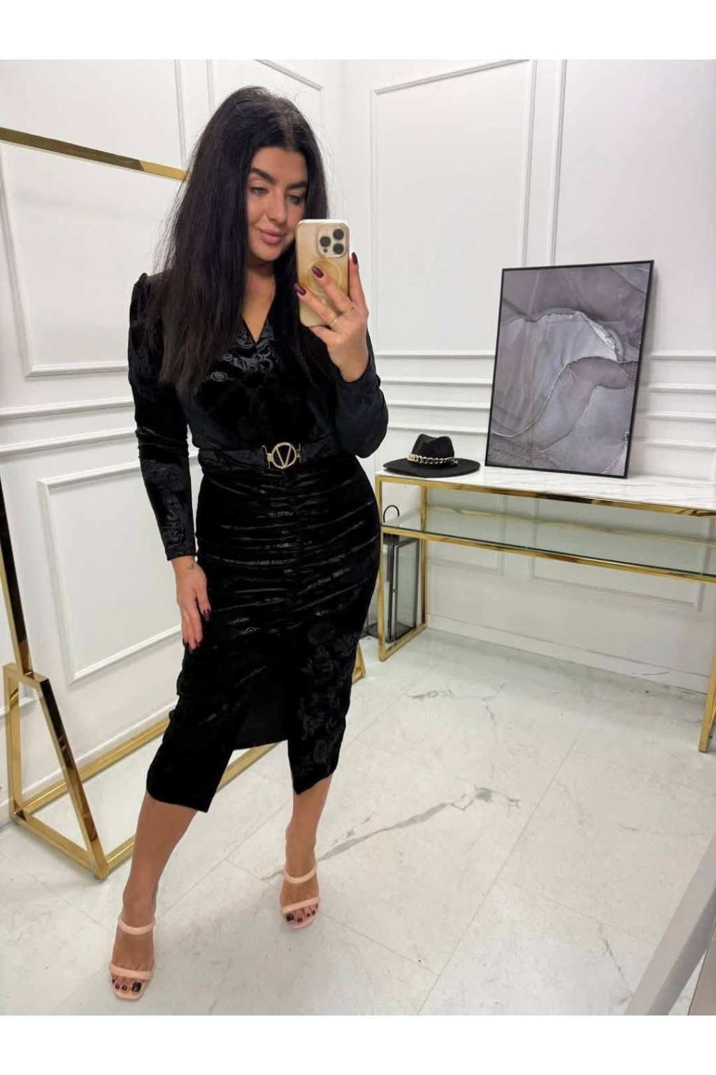 Nádherné sametové šaty doplněné vzorem. Mají dlouhý rukáv a přes bříško řasení. Na sukni je vpředu rozparek. K šatům je opasek.