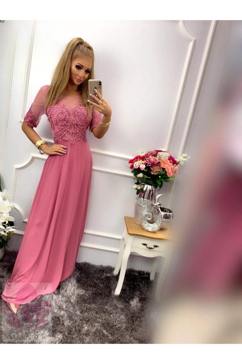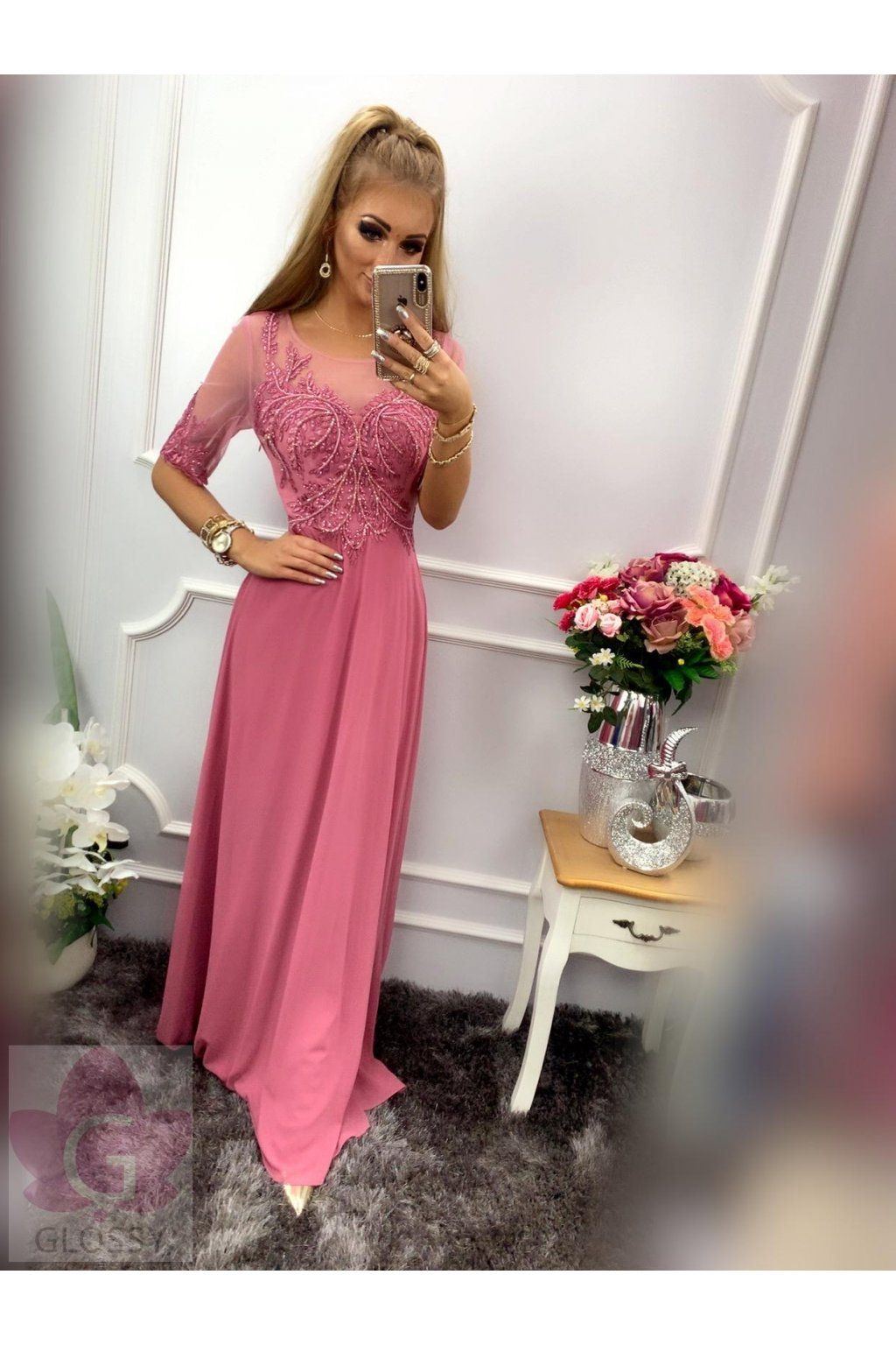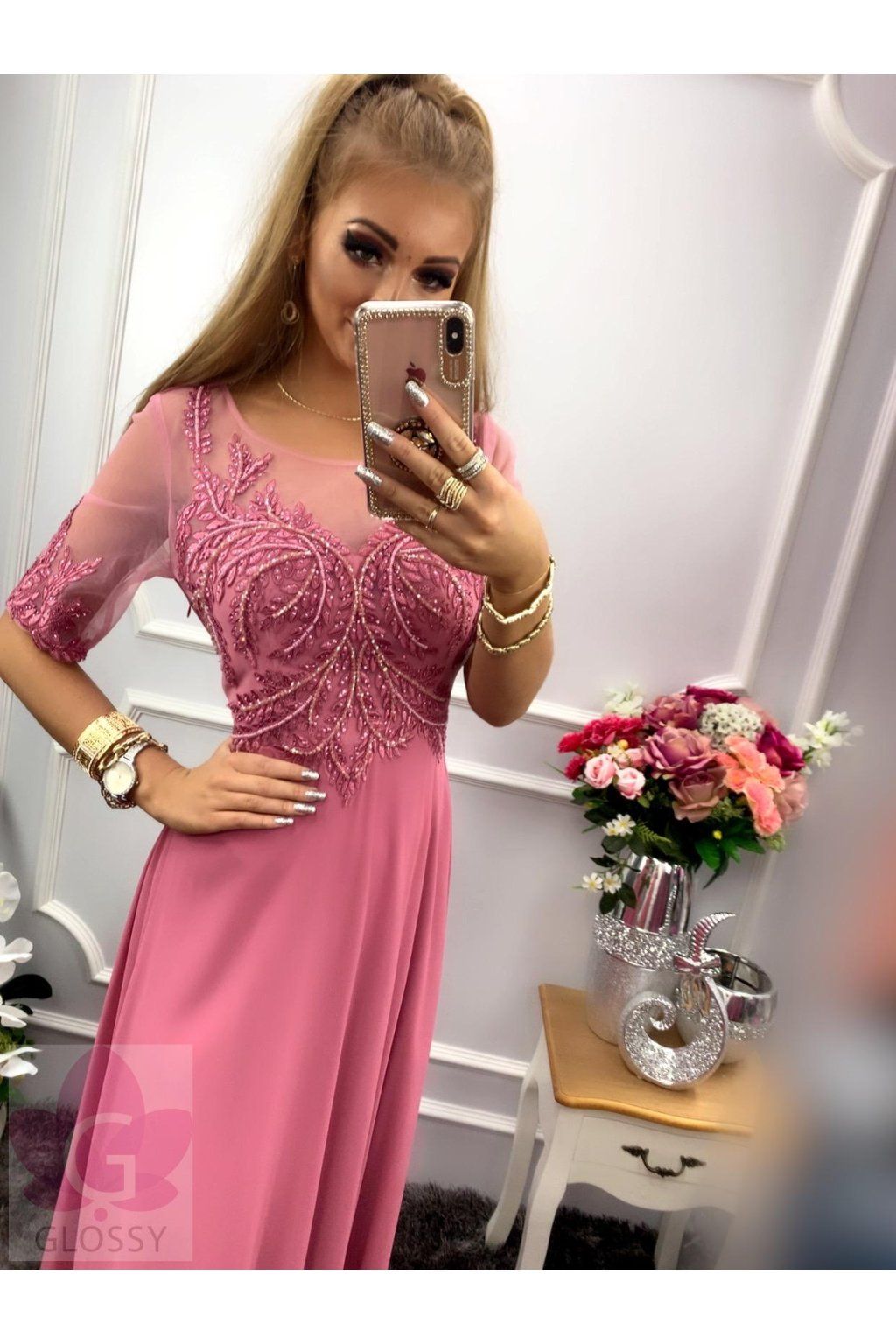 Vrchná časť šiat je zdobená kamienkami a flitrami. Šaty majú krátke rukávy a vzadu majú gumičku. Sukňa je dlhá a padavá. Má spodnicu. Zapínanie na boku pomocou zipsu.