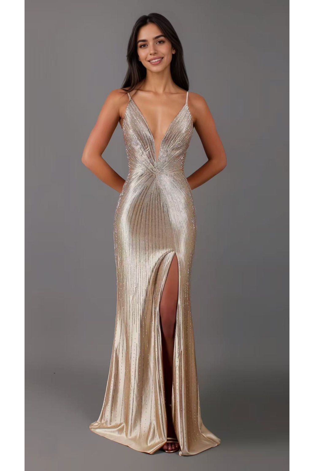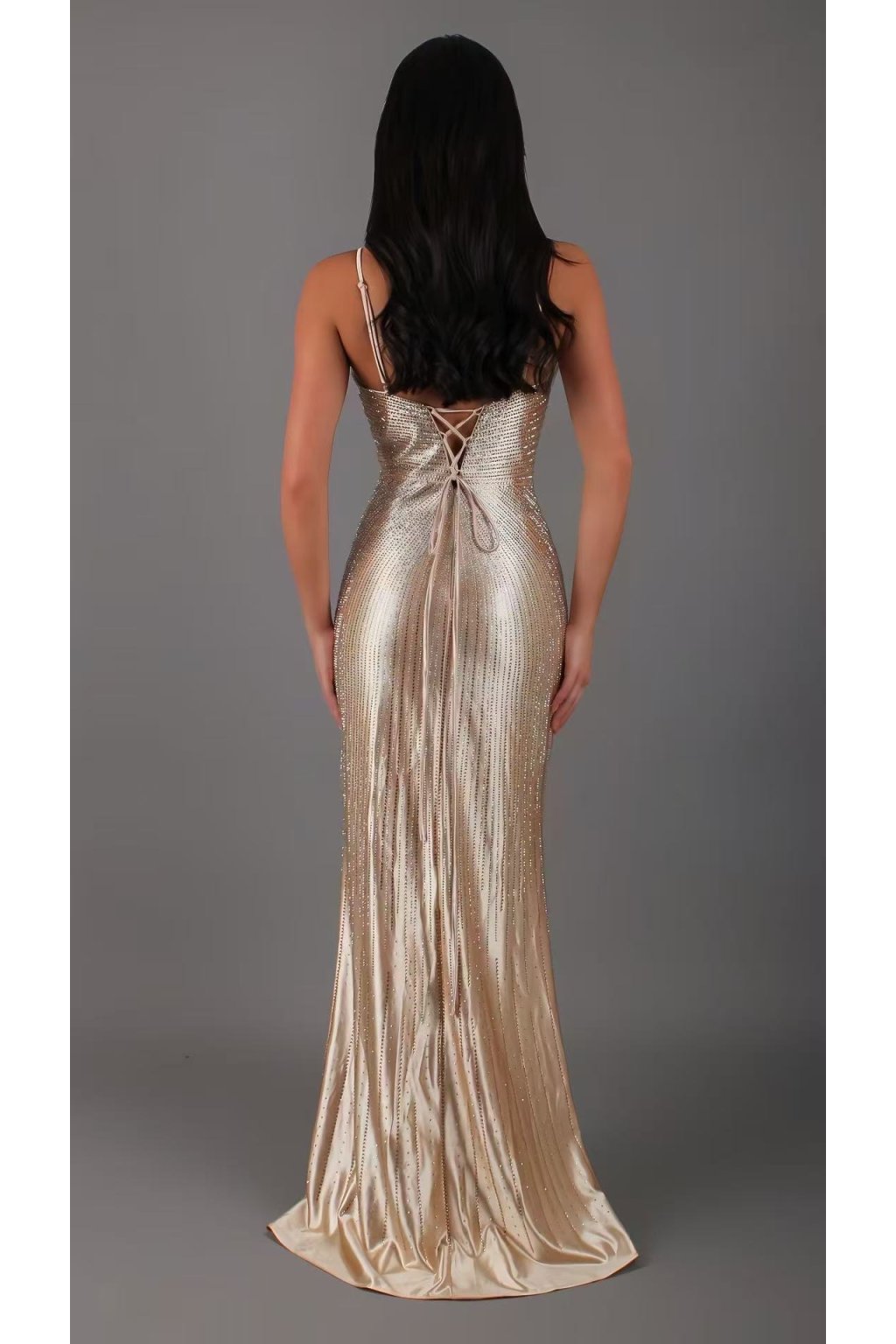 Exkluzívne dlhé priliehavé šaty na ramienka vám padnú do oka už na prvý pohľad. Celé šaty sú zdobené kamienkami. Kamienky menia farbu. Výstrih je hlboký, véčkový. Ramienka sú nastaviteľné. Na prsiach sú vystužené. Dlhá sukňa je na jednej strane rozstrihnutá. Šaty sa zapínajú zozadu pomocou zipsu a viazania.