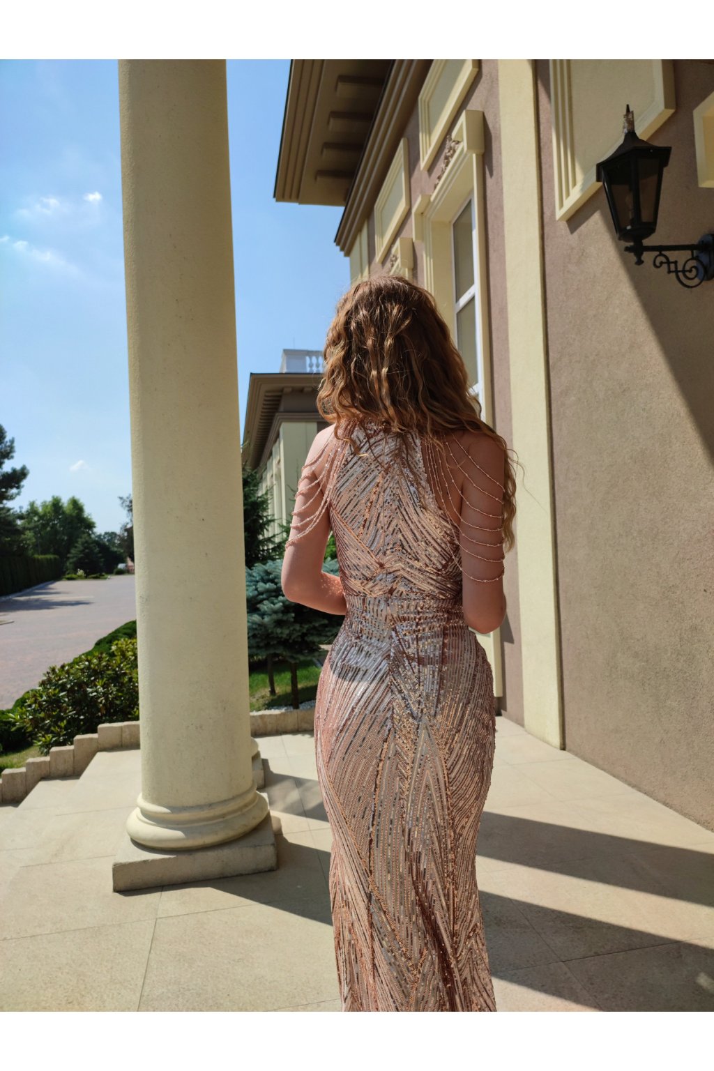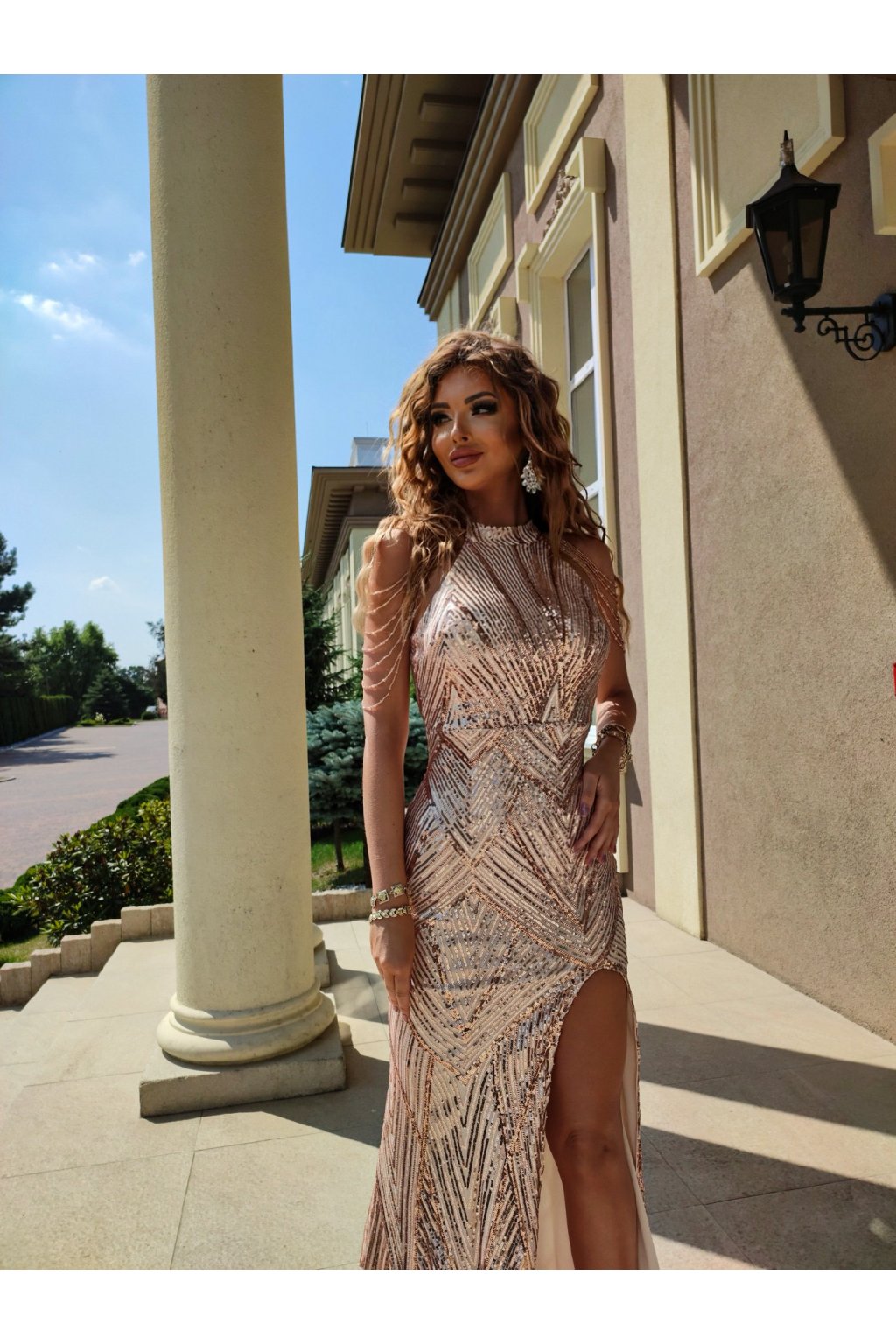 Očarte na svadbe, stužkovej či inej spoločenskej udalosti v týchto luxusných flitrovaných šatách. Budete sa v nich cítiť výnimočne a pritom pohodlne. Šaty majú mäkkú podšívku a na prsiach sú vystužené. Cez ramená majú ozdobné kamienky. Sukňa má na jednej strane rázporok. Zapínajú sa na krku na dva gombíčky a na chrbte na zips.