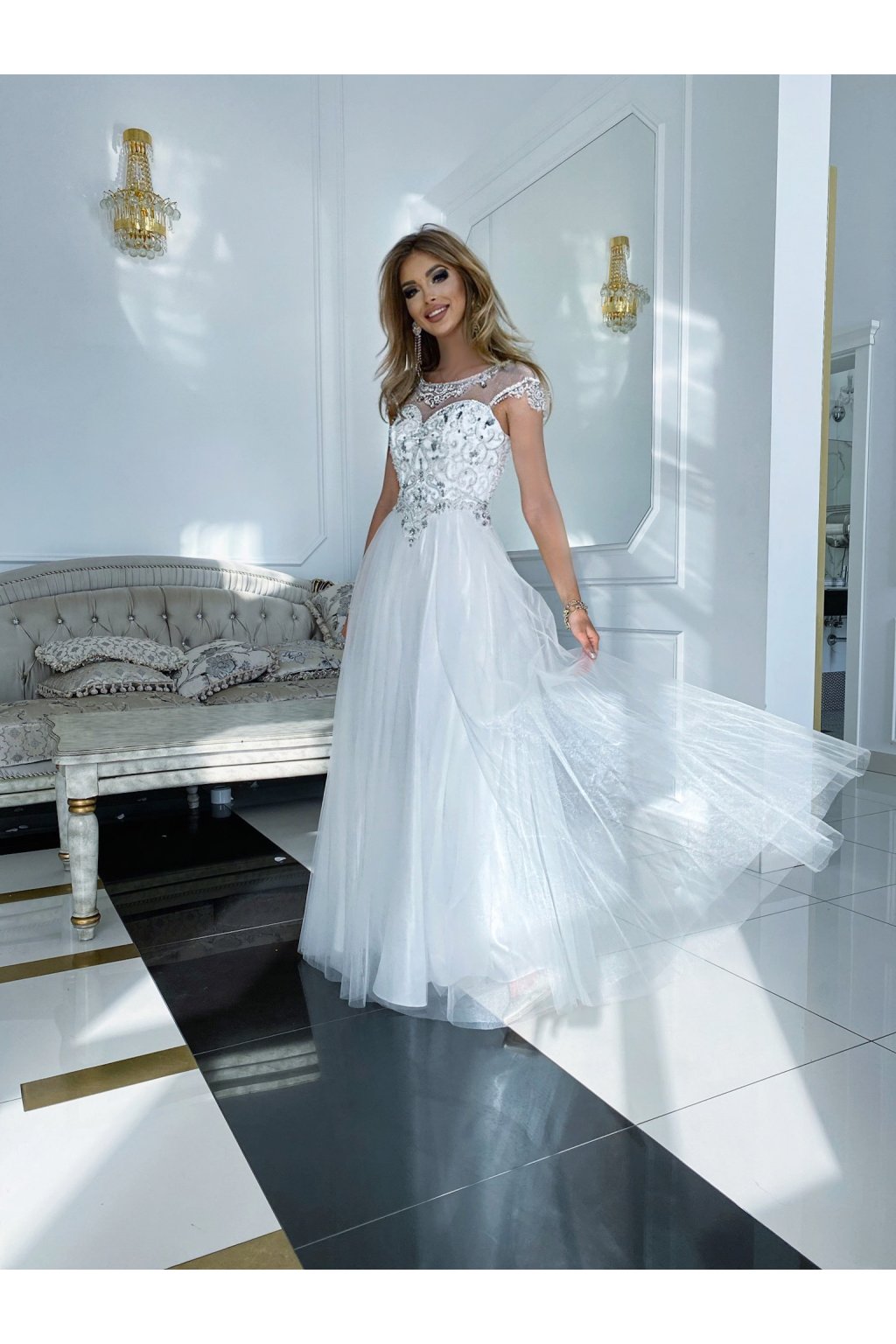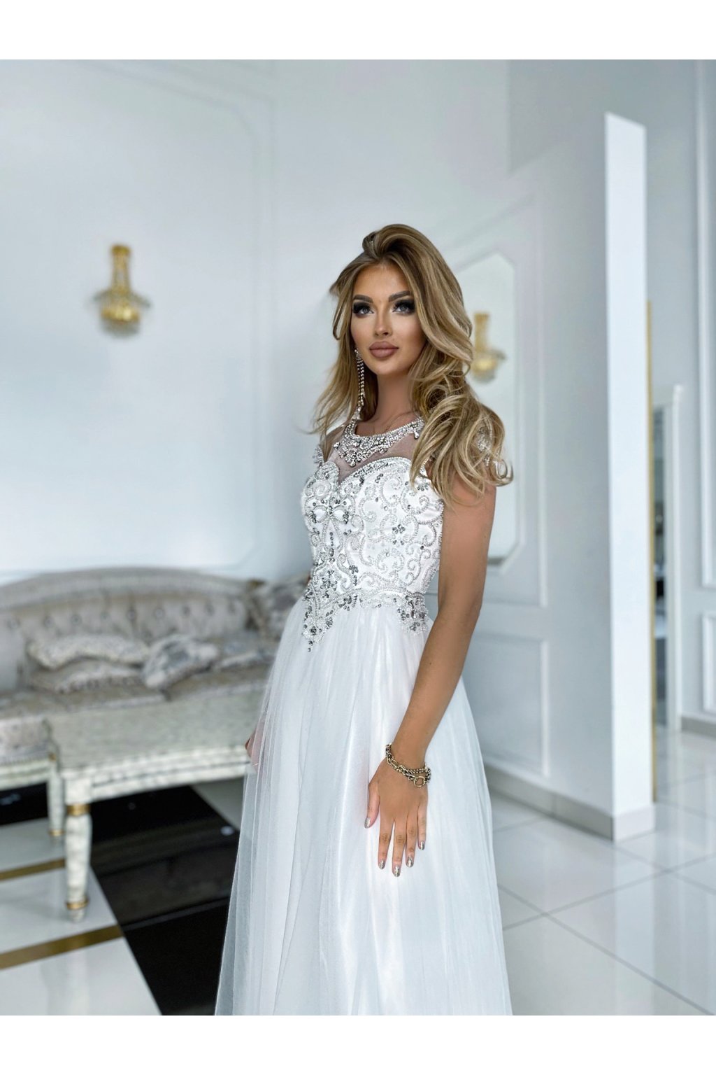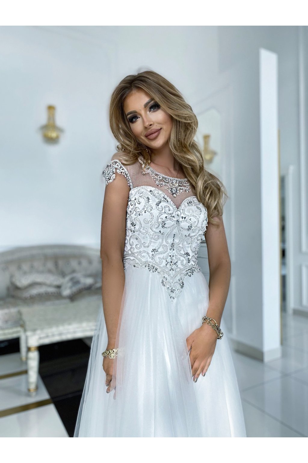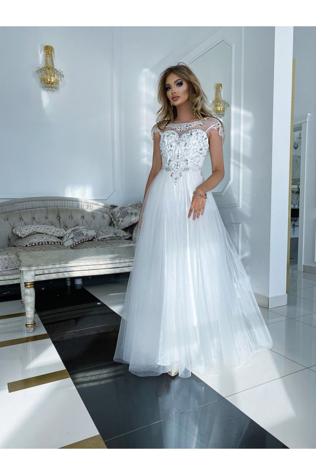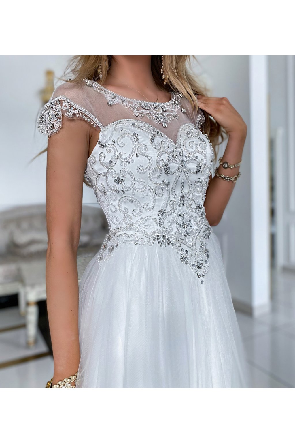 Dlhé spoločenské biele šaty s kamienkami a tylovou sukňou