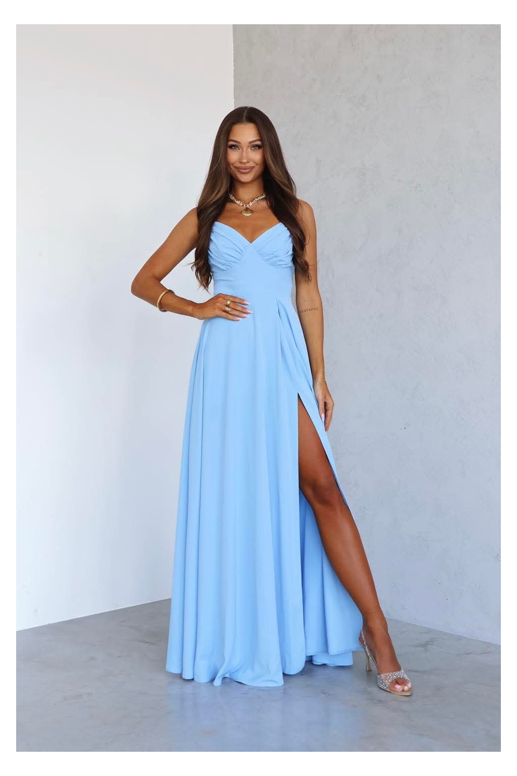 Dlhé spoločenské bledomodré šaty na ramienka s viazaním