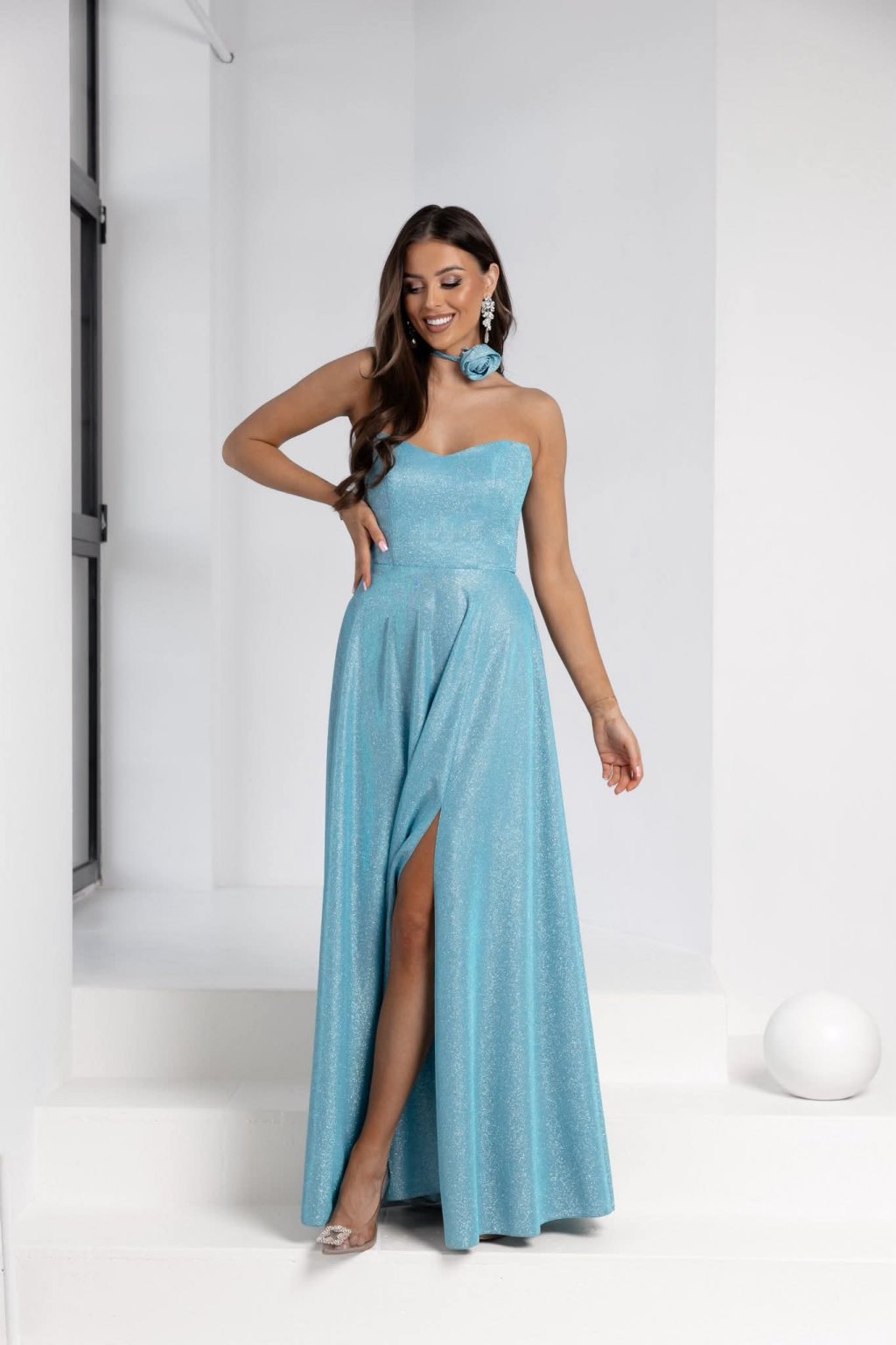 Jedinečné, luxusné trblietavé šaty sú skvelou voľbou na plesy, svadbu či stužkovú. Celé šaty sú celé doplnené trblietkami. Šaty sú korzetové a na prsiach sú spevnené. Sukňa je dlhá, padavá a na jednej strane má rázporok. Na chrbte sa viažu na viazanie a zapínajú na zips. Súčasťou šiat je kvetina na krk alebo ruku a odnímateľné puff rukávy.