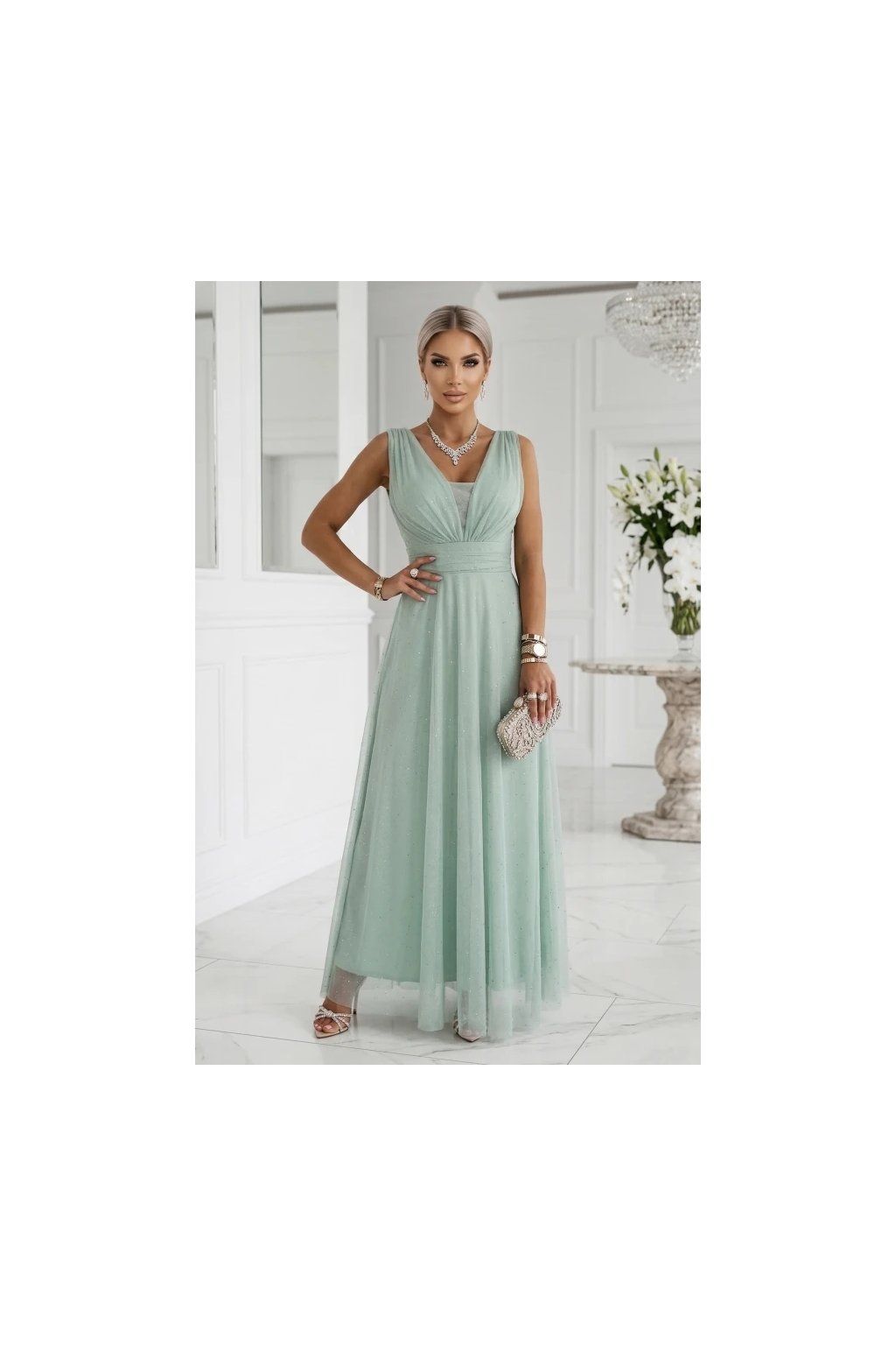 Elegantné spoločenské šaty v jemnom bledozelenom odtieni sú stelesnením ženskosti a noblesy. Ľahký, splývavý materiál s decentným trblietavým efektom pôsobí vzdušne a romanticky, zatiaľ čo prepracovaný strih krásne zvýrazní siluetu.